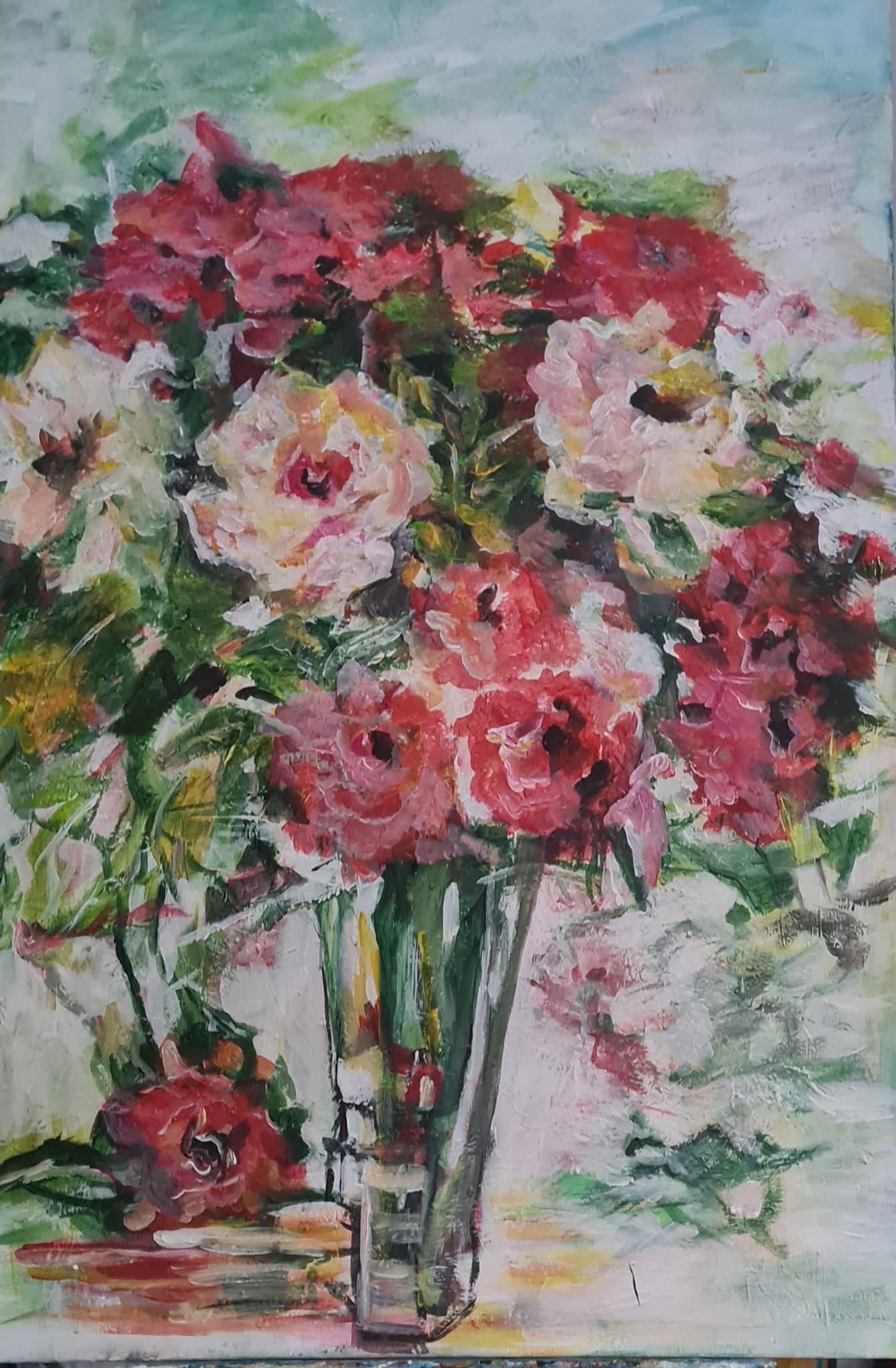 Obraz przedstawia piękny bukiet kwiatów, uchwycony w szkle, który wybucha kalejdoskopem kolorów. Czerwień, róż i biel dominują, tworząc harmonijną gamę odcieni. Zielone liście wplątane w kompozycję dodają świeżości i kontrastu. Pociągnięcia pędzla są dynamiczne, co wskazuje na impresjonistyczny styl artysty. Ruch i życie kwiatów zdają się być niemal namacalne, jakby za chwilę miały poruszyć się w delikatnym wietrze. Obraz emanuje spokojem, ale i jakimś dynamizmem jednocześnie, przywodząc na myśl poranek w ogrodzie pełnym światła. Patrząc na niego, czuć zapach wiosny, a serce bije mocniej z radości Atmosfera dzieła jest bardzo uplifting, że tak powiem. Angielski pasuje tu jak ulał. Technika użyta w obrazie łączy grubo nałożoną farbę z subtelnymi przejściami kolorystycznymi, dając efekt głębi i tekstury. Każdy kwiat ma swoją unikalną formę, co sprawia, że można wpatrywać się w nie w nieskończoność. Artysta uchwycił emocje w sposób, który porusza odbiorcę, zmuszając do zatrzymania się na chwilę i spojrzenia na piękno, które daje nam natura. Wygląda jak bajka, myślę sobie stojąc przed tym dziełem. Coś magicznego w prostocie tego obrazu sprawia, że człowiek czuje się lepiej, bardziej connected.