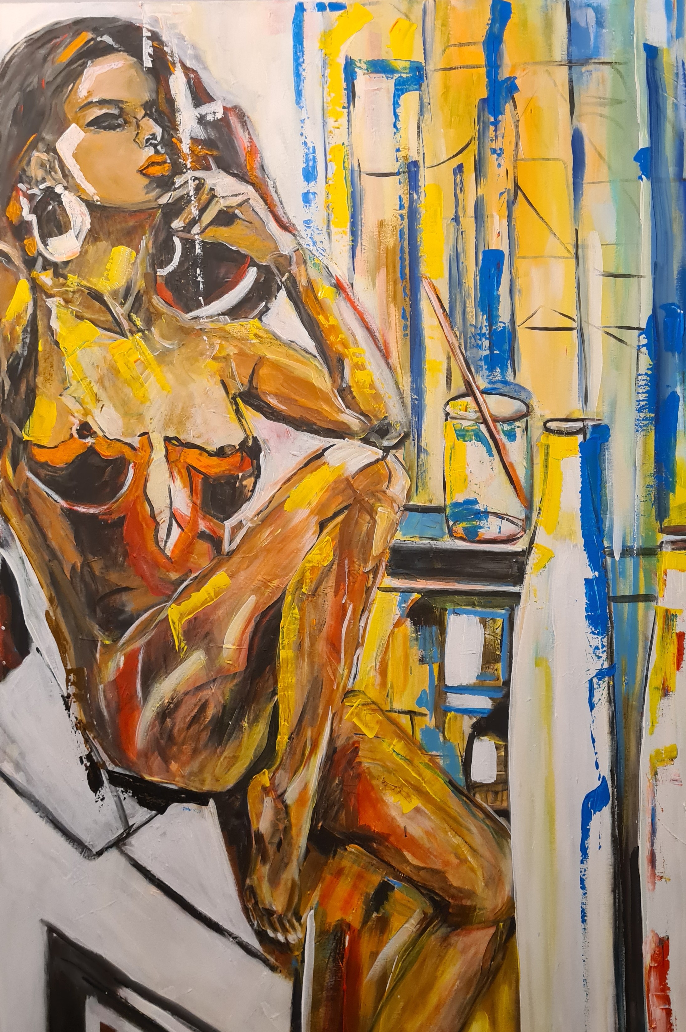 Na obrazie dominuje intensywna paleta barw, gdzie żółcie i czerwienie mieszają się z odcieniami niebieskiego i zieleni. Kobieta, której zarys ciała jest przedstawiony w ekspresyjnym stylu, siedzi zadumany nieco zamyślona przy stoliku. Jej postać zdaje się tańczyć wśród farb, co sugeruje, że artysta zastosował dynamiczne pociągnięcia pędzla, pełne energii i życia, w stylu przypominającym nieco ekspresjonizm. Patrząc na ten obraz, można poczuć mieszankę spokoju i napięcia, jakby kobieta myślała o czymś ważnym. Atmosfera jest naładowana emocjami, tworząc swoisty kontrast. Obserwując tę kompozycję, czuć gorąco letniego popołudnia, gdzie słońce wydaje się topić wszystko wokół. Tło, złożone z złoto-żółtych pociągnięć, dodaje ciepła i blasku. Z kolei siedząca kobieta emanueje melancholią. To niemal jakby obraz mówił: "do not disturb", jakby chciał zasłonić jej myśli przed światem. Mały chłopczyk mógłby powiedzieć: "Ona chyba myśli o psie!". Obraz prowokuje do refleksji, przyciągając i jednocześnie zostawiając pole do interpretacji. Skłania do zatrzymania się na chwilę. Włóż trochę siebie w widok tego dzieła, a odkryjesz coś hidden, co jest na pozór niewidoczne.