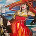 Obraz przyciąga wzrok intensywną paletą barw i dynamiczną kompozycją. Dominują czerwienie i odcienie niebieskiego, które idealnie kontrastują z czarno-białymi elementami, nadając dziełu wyrazistości. Kobieta w czerwonej sukni z szerokim kapeluszem zdaje się emanować pewnością siebie. Jej spojrzenie, pełne tajemnicy, przyciąga jak magnes. Nastrój obrazu jest zarówno elegancki, jak i tajemniczy, jakby zatrzymany w połowie zdania. Można by powiedzieć, że artysta zastosował technikę, która przypomina mix tradycyjnego malarstwa z nowoczesnym, bardziej swobodnym podejściem. Te intensywne kolory i odważne pociągnięcia pędzla wnoszą do pracy elementy energii i ruchu. A ja myślę, że ta pani wygląda jak postać z bajki! Dla odbiorcy obraz może być inspiracją do refleksji nad kobiecością i niezależnością. Element surprise kryje się w każdym zakątku płótna. Jest coś fascynującego w tym, jak artysta balansuje między figuratywnością a abstrakcją. To jeden z tych obrazów, na które można patrzeć, patrzeć i zawsze odkrywać coś nowego.