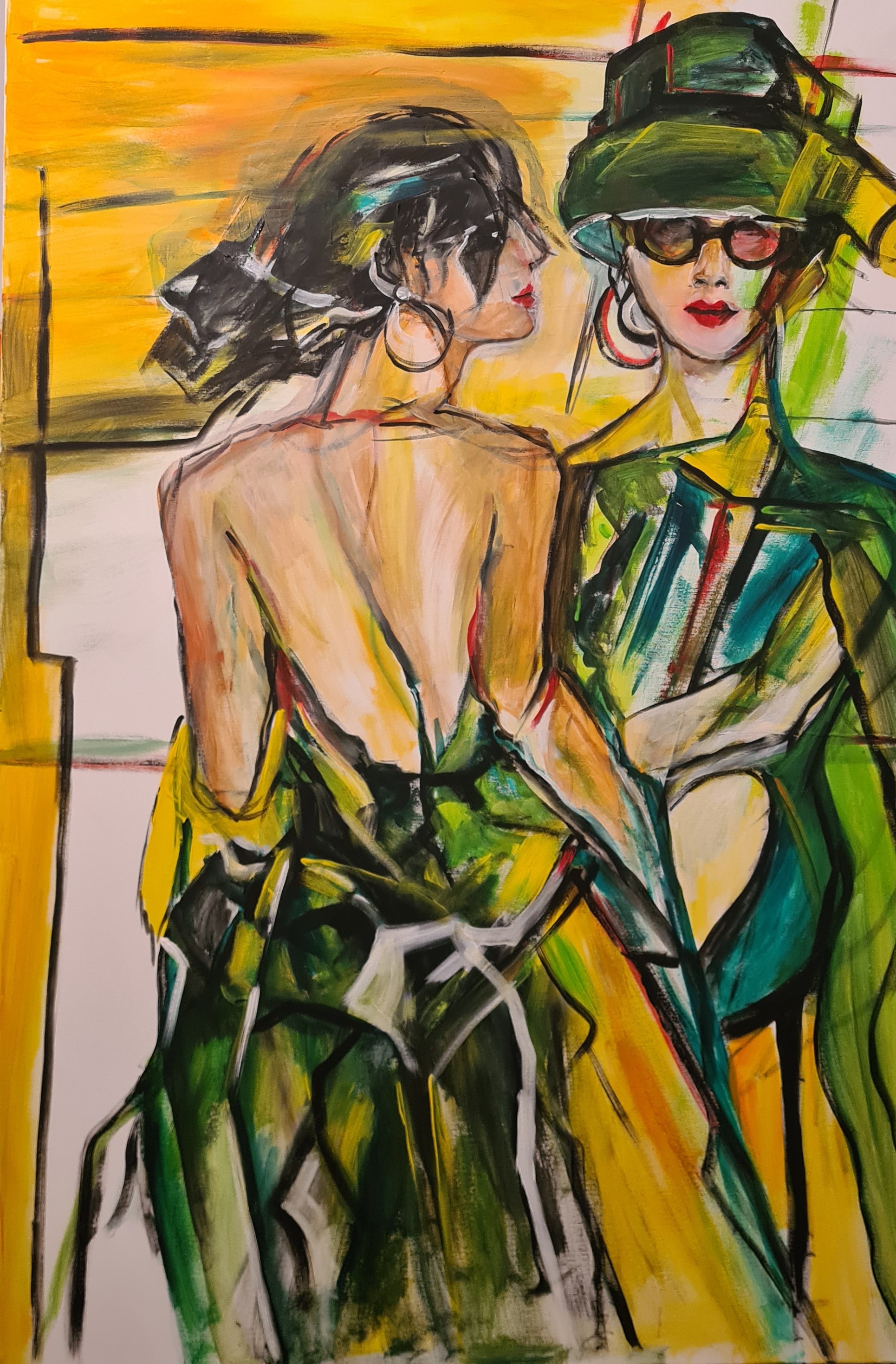 Obraz pełen kolorów, niczym kalejdoskop, z wyrazistymi żółciami, zielenią i akcentem czerwieni, które przewijają się przez całe płótno. Dwie postacie dominują w centrum dzieła. Jedna z nich ubrana w eleganckie okulary i kapelusz, druga zwrócona plecami, w wyjątkowym, zwiewnym stroju. Tło to abstrakcyjne plamy i linie, które dodają dynamizmu. Atmosfera dzieła jest nieco tajemnicza i ekscytująca. Czujesz się jak w środku busy city life, pełnego energii i ruchu. Styl artystyczny to coś pomiędzy ekspresjonizmem a kubizmem. Artysta korzysta z szerokich, pewnych pociągnięć pędzla, które tworzą wrażenie ruchu i spontaniczności. Malowidło wywołuje całą gamę emocji. Od radości i podziwu, po nutę nostalgii. Emocjonalność postaci budzi ciekawość, kim one są, co robią, jak się czują. Jeden obraz, a tyle pytań. I jest ta jedna myśl: ciekawe, co wydarzyło się przed chwilą? Kolory, style, dynamiczne pociągnięcia – to coś co można by śmiało określić jako mesmerizing._styles. Zdecydowanie warto zawiesić na chwilę oko, odpocząć, zatracić się w kolorach. A teraz będe malował!
