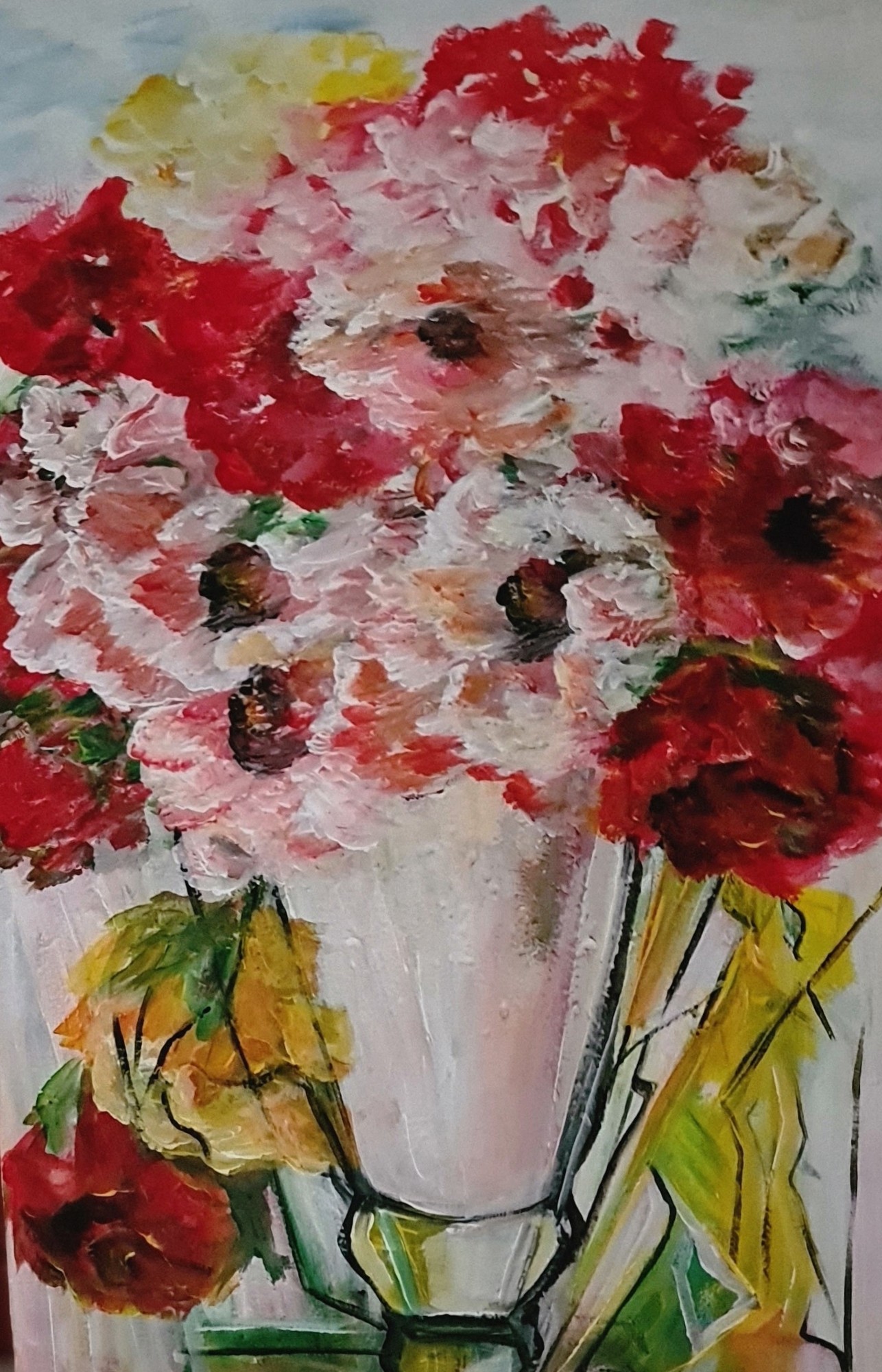 Obraz przedstawia bukiet kwiatów o intensywnych kolorach, które rzucają się w oczy. Czerwone i różowe kompozycje dominują, przeplatane delikatnymi białymi i żółtymi akcentami. Kwiaty ułożone są w bezładnym artystycznym nieładzie, co nadaje im naturalnego uroku. Tło jest rozmyte, niebieskawe, co sprawia wrażenie lekkiej mgiełki. Obraz emanuje spokojem i radością - jak letni dzień, kiedy czas zwalnia, a świeżość kwiatów dodaje energii. Styl jest impresjonistyczny, z widocznymi pociągnięciami pędzla. Artysta, stosując technikę impasto, dodaje teksturę, dzięki czemu powierzchnia wydaje się niemal trójwymiarowa. Patrząc na kwiaty, można poczuć ich delikatny zapach i zobaczyć, jak poruszają się na wietrze. Wyobrażam sobie ogrodnika, który zerwał te kwiaty z myślą o bliskiej osobie. Obraz wzbudza ciepłe emocje - happiness. Przypomina mi czasy dzieciństwa spędzane na wsi, kiedy biegałem po łąkach. Jest pełen życia, ale jednocześnie uspokajający. Ten kawałek sztuki to prawdziwa uczta dla oczu i duszy, przywołująca wspomnienia o prostych radościach. Żółte kwiatki są jak słońce - powiedziałby siedmiolatek, ciesząc się chwilą.