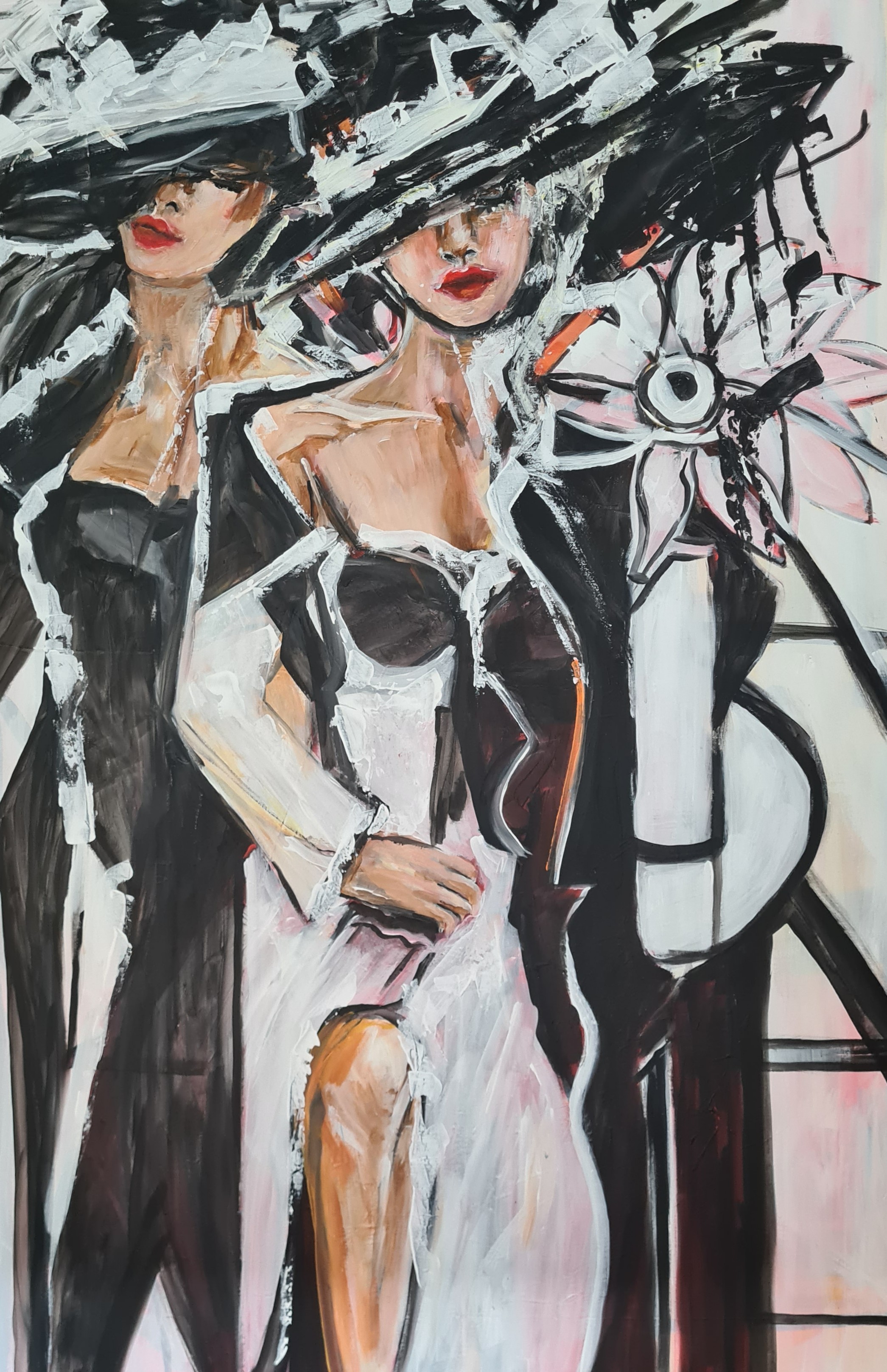 Obraz przyciąga wzrok swą dynamiczną kompozycją i kontrastowymi kolorami. Dominują odcienie czerni, bieli i różu, które stworzyły niezwykle wyraziste przedstawienie dwóch postaci. Każda z nich skrywa oczy za czarną opaską, co dodaje tajemniczości. Kształty są geometryczne i ostre, co przywodzi na myśl sztukę kubistyczną. Rysowane grubą, energiczną kreską, nadają całości surowy charakter. Atmosfera jest jednocześnie dynamiczna i enigmatyczna. Wow, jakbym widziała film sci-fi. Styl artysty sugeruje wpływy ekspresjonizmu, co podkreśla emocjonalna intensywność obrazu. Prostota form kontrastuje z bogactwem interpretacji, jakie mogą wynikać z ukrytych oczu. To powoduje, że widz może zastanawiać się, co te postacie naprawdę czują czy ukrywają. Jest takie wow, bo te postacie mają jakieś secret. Dzieło pełne jest kontrastów. Czarna sylwetka postaci tworzy silne zestawienie z bladością skóry i różowych akcentów, przez co wygląda to jak zderzenie dwóch światów. Ten obraz może prowokować refleksję nad identytetm i maskami, które nosimy w życiu codziennym. To masterclass w ukazywaniu skrywanych emocji. Feeling so mysterious! Malarska technika, choć wydaje się niechlujna i przypadkowa, jest pełna świadomego zamysłu i precyzji. I to jest super!