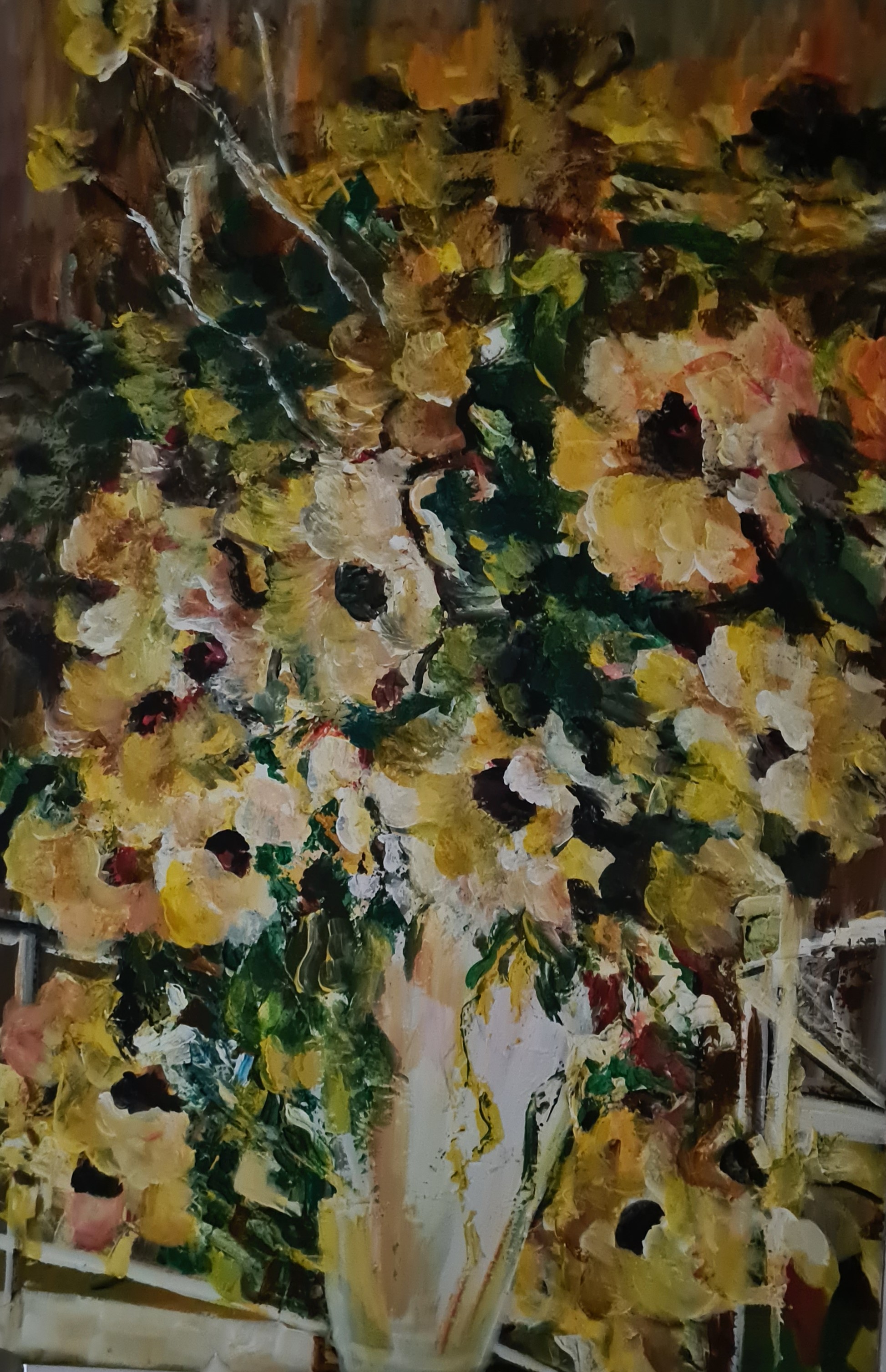 Obraz przedstawia bogaty bukiet kwiatów, który wybucha kolorami, dominującą tonacją jest żółć przeplatana zielenią i odrobiną różu. Kwiaty jakby kipią z wazonu, który z pewnością widział niejedno przyjęcie na ganku. Przebijają się kształty rozwianych płatków, tworząc wrażenie chaotycznej harmonii. Artysta wykorzystał impast, co daje teksturze niemal namacalną intensywność. Kiedy patrzysz, czujesz jak obraz emanuje ciepłem letniego popołudnia. Słońce muskające kwiaty, a ty nie masz ochoty iść dalej. Kompozycja przypomina taniec – dynamiczny, ale ulotny, jak wesoła zabawa w ogrodzie. "Halo! To są kwiatki!" krzyknąłby siedmiolatek z podziwem. Technika jest swobodna, niemal impresjonistyczna, co dodaje dziełu lekkości. To arcydzieło? Być może nie, ale zdecydowanie zostaje w pamięci. Te kwiaty, choć już ścięte, zdają się szeptać do nas o przemijającej chwili, zatrzymanej w "forever moment" na płótnie. Atmosfera jest nostalgiczna, ale jednocześnie pełna życia.
