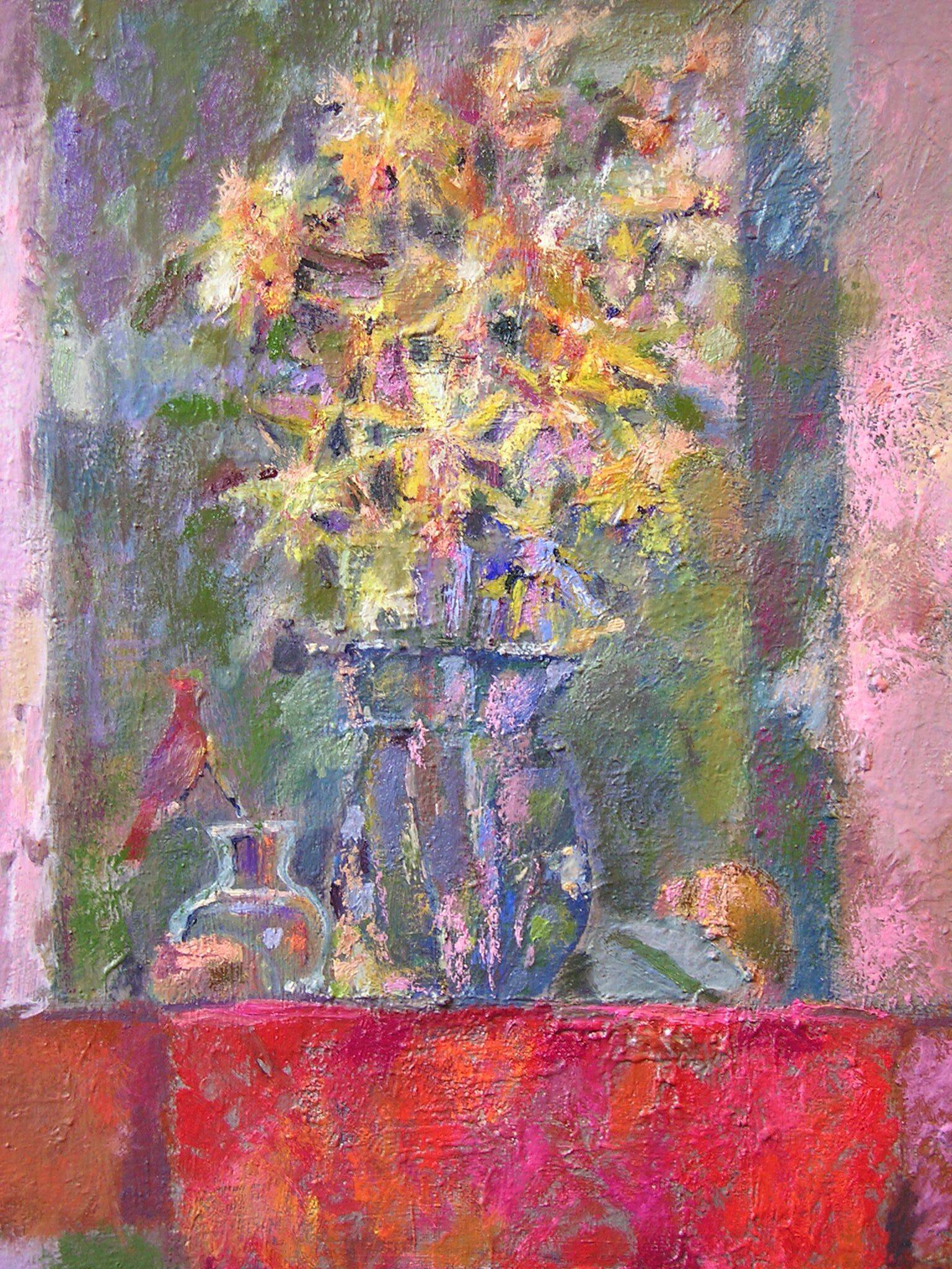 pawel szmyd - żółty bukiet na czerwonym obrusie