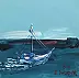 Das Gemälde zeigt ein Boot, das auf einer ruhigen, saphirblauen Wasseroberfläche schaukelt, mit einem atemberaubend blauen Himmel im Hintergrund. Der Kontrast zwischen dem dunklen Meer und dem hellen Himmel verleiht dem Stück eine dynamische und dennoch beruhigende Atmosphäre. Das Boot ist schlicht, aber ausdrucksstark und mit energischen, leicht chaotischen Pinselstrichen dargestellt. Während Sie das Gemälde betrachten, können Sie die leichte Brise des Meereswinds und diese unglaubliche Stille spüren, in der nur die Wellen zu sehen sind, die sanft gegen die Seite schlagen.
