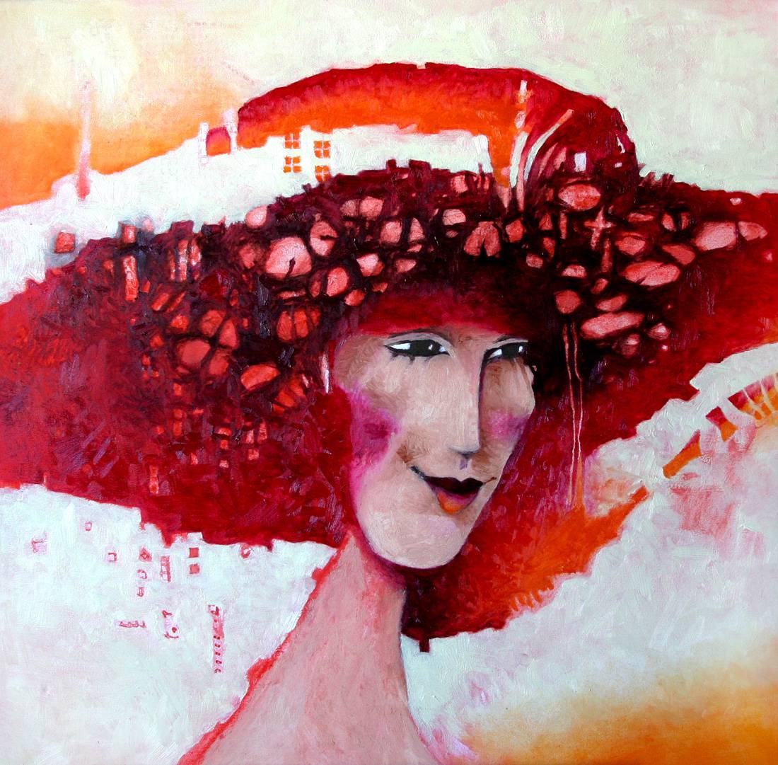 Auf dem Bild ist eine fantasievolle weibliche Gestalt zu sehen. Warme Rot-, Rosa- und Orangetöne dominieren und verleihen der Komposition Energie. Der große Hut der Frau, aus geometrischen Formen aufgebaut, erinnert an einen Sturm aus Blumen und Blättern. Starke Kontraste von Weiß und Schwarz betonen das Gesicht und verleihen ihm eine markante Ausdruckskraft. Die Atmosphäre des Bildes ist etwas geheimnisvoll, wie aus einer anderen Welt, aber zugleich optimistisch. Die Künstlerin arbeitet mit der Impasto-Technik, was man an den Unebenheiten der Farbe sieht; so entsteht eine Textur, fast schon „magisch“. Beim Betrachten dieses Bildes kann man Freude und Unbeschwertheit spüren. Der Gesichtsausdruck der Frau ist voller feiner Ironie, sodass man sich fragt, was sie hinter diesem leicht ironischen Lächeln verbirgt. Vielleicht erzählt sie in ihren Gedanken ihre Geschichte – wer weiß? Der Stil des Werks ist eindeutig expressiv, er strahlt Emotionen aus. Meine Schwester sagte: „Sie hat einen großen Hut wie Tante Basia!“, was sehr niedlich war. Ich frage mich, wer diese Figur für die Künstlerin war. Vielleicht jemand Nahestehendes, oder doch nur ein Produkt der Fantasie? Dieses Bild ist wie eine Reise ins Unbekannte, und ich kehre gern zu ihr zurück.