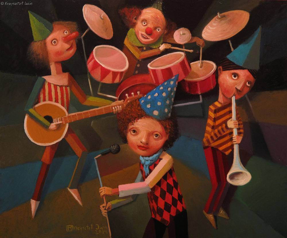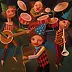 Dieses Bild ist eine wahre Mischung aus Farben und Formen, die die Blicke auf sich zieht. Die Figuren darauf sind voller Leben, mit großen, ausdrucksstarken Augen, die den Betrachter geradezu anschreien. Die Farben sind lebendig und kontrastreich: saftige Rottöne, tiefe Grüntöne und subtile Braunnuancen bilden eine dynamische Komposition. Jede der Personen hält ein Instrument, als würden sie gleich ein magisches Konzert beginnen. Die Atmosphäre ist voller Energie – so sehr, dass man sich dieser kindlichen Freude anschließen möchte. Der Stil des Künstlers erinnert ein wenig an den Kubismus, mit geometrischen Formen und überzeichneten Proportionen. Das Bild verströmt unbeschwerte Spielfreude und eine gewisse Dosis Surrealismus. Beim Betrachten spürt man eine Nostalgie nach der Kindheit und ihren unschuldigen Spielen. Die Maltechnik ist recht locker, wodurch das Ganze weniger formell und natürlicher wirkt. Schau dir die Freude in ihren Gesichtern an! Es zieht die Aufmerksamkeit auf sich und lässt den Betrachter spüren, dass er sich diesem improvisierten Orchester anschließen möchte. Was würde wohl ein Siebenjähriger dazu sagen? Wahrscheinlich so etwas wie: „Ich will auf dieser großen Trompete spielen!“ Jedes Element des Bildes lebt sein eigenes Leben und ist zugleich Teil eines größeren Ganzen.