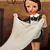 Das Gemälde zeigt die Gestalt eines Mädchens in einer Schürze, das behutsam ein weißes Tischtuch ausbreitet. Der Hintergrund ist dezent, in Brauntönen, und über ihr hängt ein schlichter, doch eleganter Kronleuchter, dessen Licht die Szene subtil erhellt. Die Bildkomposition ist schlicht, lenkt den Blick jedoch wirkungsvoll auf die zentrale Figur und die Zartheit des Stoffes, den sie hält. Die Farben sind warm; Beige-, Weiß- und Schwarztöne dominieren und erzeugen eine gemütliche Atmosphäre. Der künstlerische Stil scheint vom Surrealismus mit einer Prise Nostalgie inspiriert zu sein. Das Gesicht des Mädchens, mit auffallend großen, ausdrucksstarken Augen, verleiht dem Ganzen Zartheit und einen Hauch von Traumhaftigkeit. Die Technik ist recht impressionistisch; die sichtbaren Pinselstriche vermitteln den Eindruck von Bewegung und Lebendigkeit. Das Gemälde kann unterschiedliche Emotionen hervorrufen. Einerseits mag es Kindheitserinnerungen wecken, andererseits wirkt es vielleicht ein wenig melancholisch. Das Mädchen wirkt nachdenklich, vielleicht ein bisschen verloren. Und wenn ich in ihre Augen blicke, empfinde ich eine gewisse Zärtlichkeit. Es ist ein bisschen wie einen Film zu sehen, bei dem wir bis zum Schluss nicht wissen, wie er enden wird. Könnte dieses Gemälde noch bezaubernder sein? Die Beschreibung strahlt Einfachheit aus und zieht zugleich in die Welt der kleinen Protagonistin hinein. Ein Kind würde sagen: „Das Mädchen bereitet etwas vor und hat wohl eine wichtige Aufgabe.“ Und darin liegt die ganze Schönheit dieses Bildes. Es hat etwas an sich, das uns innehalten lässt, um darin unsere eigenen Erinnerungen und Gefühle wiederzufinden.