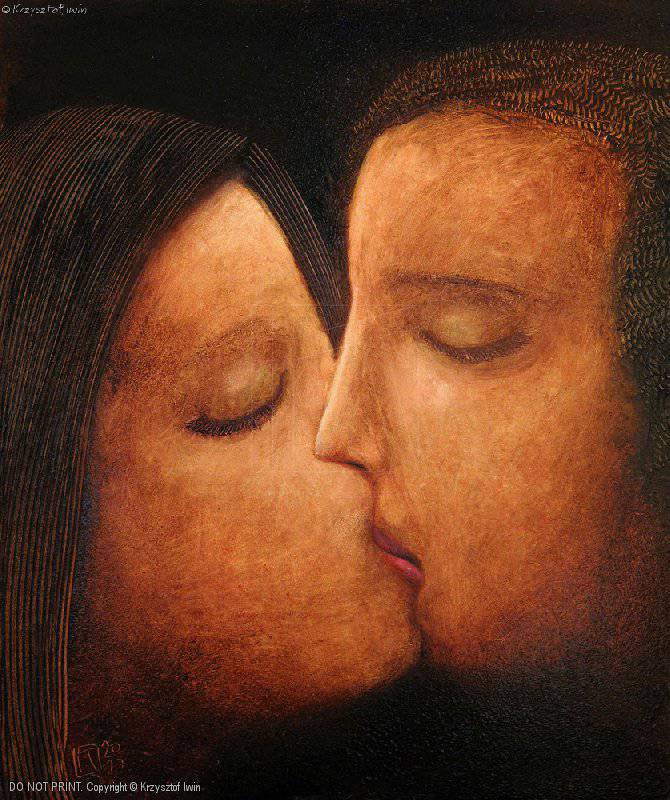 Das Bild zeigt eine intime Kuss-Szene zweier Figuren, die einander sehr nahe sind, ja fast zu einer Einheit verschmelzen. Warme Braun- und Orangetöne dominieren, die der Komposition einen weichen, gemütlichen Charakter verleihen. Die Gesichter der Figuren sind zart und subtil angedeutet, was einen Hauch von Geheimnis suggeriert. Die Atmosphäre des Werks ist ernst, zugleich aber von Ruhe erfüllt. Beim Blick auf das Bild entsteht der Eindruck, die Zeit sei stehen geblieben. Der Künstler hat die Technik kleiner Pinselstriche verwendet, was dem Bild Textur und Tiefe verleiht. Es wirkt, als sei das Bild ein wenig magisch und zeitlos. Der Betrachter kann Ruhe und Freude empfinden, aber auch eine zarte Traurigkeit oder Nostalgie. Die Interpretation kann vielfältig sein – vom Symbol der Liebe bis zur Reflexion über die Vergänglichkeit der Augenblicke. Der kleine Jaś würde wohl sagen: „Die küssen sich!“. Der Stil des Malers erinnert an klassische Techniken, zugleich ist hier eine moderne Schlichtheit zu erkennen. Es erinnert mich daran, wie es sich anfühlt, wenn ein wichtiger Moment für immer festgehalten wird. Jeder von uns könnte kurz innehalten, tief durchatmen und sich von den Emotionen tragen lassen.