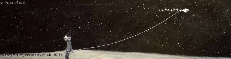 Auf dem Bild ist eine Gestalt vor einem dunklen, rätselhaften Hintergrund zu sehen. Die Person hat katzenartige Gesichtszüge und eine lange, schlanke Silhouette und trägt einen grauen Mantel. In der Hand hält sie eine lange Schnur, an deren Ende ein silberner Diamant schwebt, wie ein Drachen, der in einem sternenerfüllten Raum hängt. Die Komposition ist schlicht und ausgewogen, mit einem feinen Kontrast zwischen der Schwärze des Himmels und der Helligkeit der Figur und des geheimnisvollen Objekts. Die Atmosphäre des Bildes ist ruhig, geradezu melancholisch, und zugleich faszinierend, zum Nachdenken einladend. Es hat etwas von einem Traum, von kindlichen Träumen von einer Reise zu den Sternen. Der Stil des Künstlers ist minimalistisch, mit einem ausgeprägten Sinn für Raum und Balance. Die Maltechnik lässt zarte Pinselstriche erkennen, die eine ätherische Stimmung erzeugen. Das Bild ruft eine Mischung aus Ruhe und Sehnsucht hervor. Es kann zum Nachdenken über Einsamkeit, über Bestrebungen und Träume anregen, die zum Greifen nah sind und doch so fern. "Wow, das sieht aus wie der Weltraum!" – würde ein Siebenjähriger sagen. Ein solches Kunstwerk vereint kindliche Freude mit dem erwachsenen Wunsch, das Unbekannte zu entdecken. Für mich ist das Bild wie ein magisches "Portal" in die Welt der Fantasie, in der man endlos in den Wolken – und sogar noch höher – schwelgen kann. Es hat etwas Tiefgründiges, das Herz und Seele berührt. Zarte Akzente von Farbe und Form schaffen einen Raum, der sich nicht auf die Leinwand beschränkt, sondern zu einer Reise jenseits des Blickfelds einlädt.