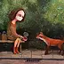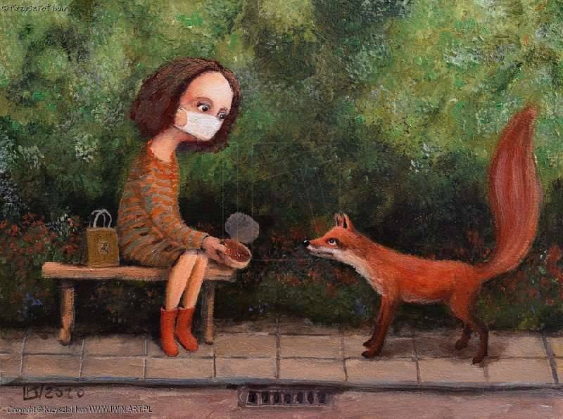 Auf dem Gemälde sehen wir ein Mädchen, das auf einer Bank sitzt, umgeben von sattem Grün. Die Farben sind intensiv und gesättigt, mit dominierendem Grün und warmem Braun. Das Mädchen trägt orangefarbene Schuhe und ein gestreiftes Kleid, was dem Bild eine Note kindlicher Unbeschwertheit verleiht. Die Maske auf ihrem Gesicht erinnert an die pandemische Realität und bringt eine nachdenkliche Note hinein. Neben ihr steht ein Fuchs, der sie neugierig ansieht, als würde er fragen: „Was hast du für mich?“ Es ist ein süßer Moment, voller Ruhe und Verbindung zur Natur. Die Maltechnik des Künstlers ist weich, beinahe impressionistisch, mit sichtbaren Pinselstrichen, die der Komposition Dynamik verleihen. Das Bild strahlt Ruhe aus, trägt aber auch eine subtile Spannung zwischen Mensch und wilder Natur in sich. Man kann fast spüren, wie der Fuchs sich gleich bewegen wird. Die Stimmung ist melancholisch, vermittelt jedoch die Hoffnung, dass Menschen und Tiere selbst in schwierigen Zeiten zusammenleben können. Es ist ein wenig wie eine Rückkehr in die Kindheit, als die Welt einfacher und magischer schien. „Ich mag Füchse auch!“, könnte ein Siebenjähriger sagen. Dieses Bild lädt dazu ein, von Harmonie zu träumen, und erinnert daran, dass die kleinen Momente oft die schönsten sind. Vielleicht denkt man beim Betrachten dieses Bildes an die Natur und daran, wie wichtig es ist, sie wertzuschätzen.