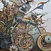 Das Bild präsentiert eine erstaunliche Mischung aus mechanischen und fantastischen Elementen, die ein wenig an eine Traummaschine erinnern. Es dominieren metallische Gold- und Kupfertöne sowie zarte Pastellfarben. Die Komposition zeichnet sich durch Komplexität und Detailliertheit aus, als ob jedes Rädchen und jede Schraube eine eigene Geschichte zu erzählen hätte. Die Atmosphäre des Gemäldes ist ein wenig geheimnisvoll, ein wenig nostalgisch, als würde es uns in eine Welt entführen, in der die Zeit anders fließt. Der Künstler verwendete surrealistische Techniken und vermischte realistische Details mit einem verträumten Stil. Dies weckt beim Empfänger Neugier und Nachdenken. Vielleicht etwas beunruhigend, als würden wir in eine andere Realität blicken.