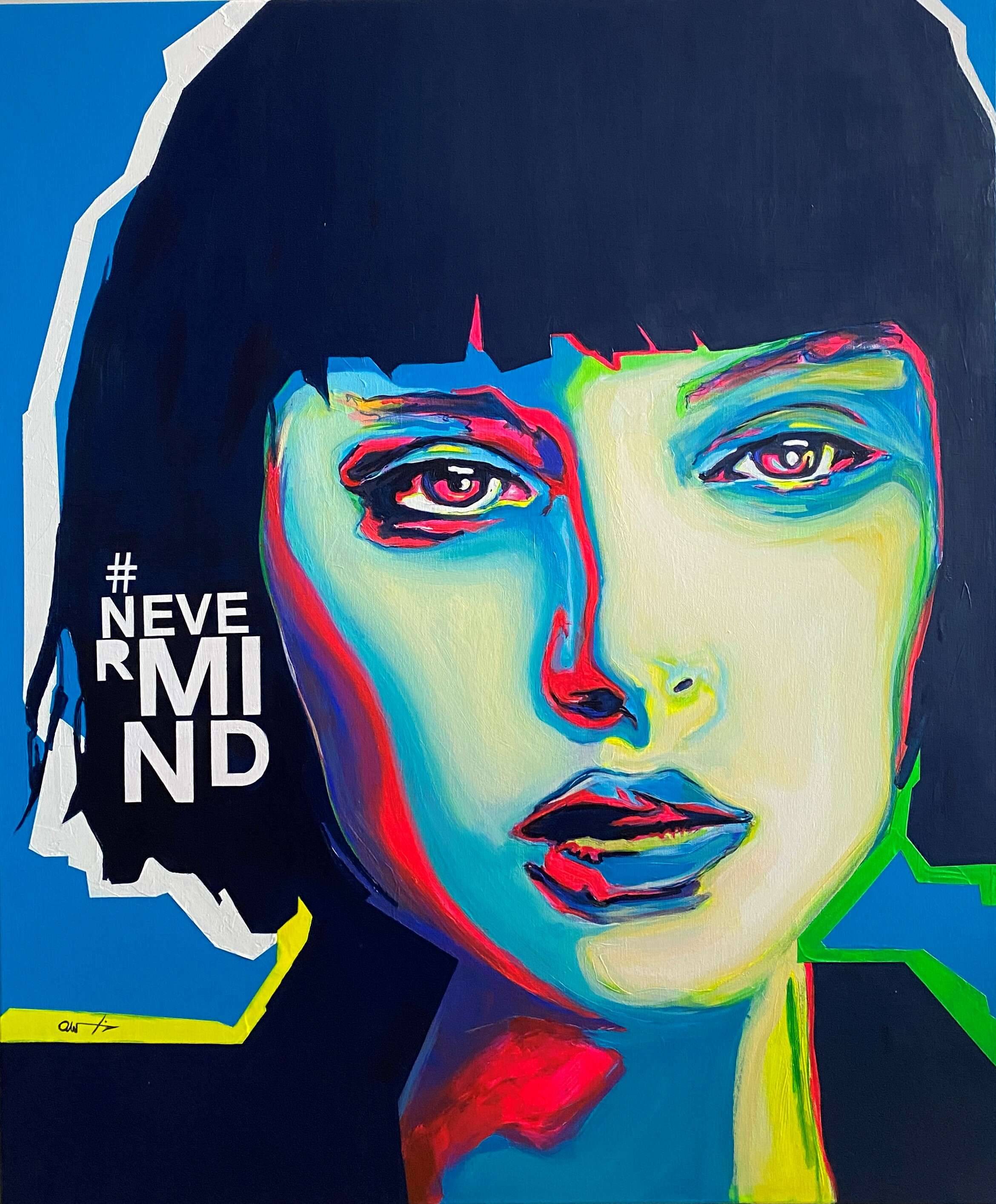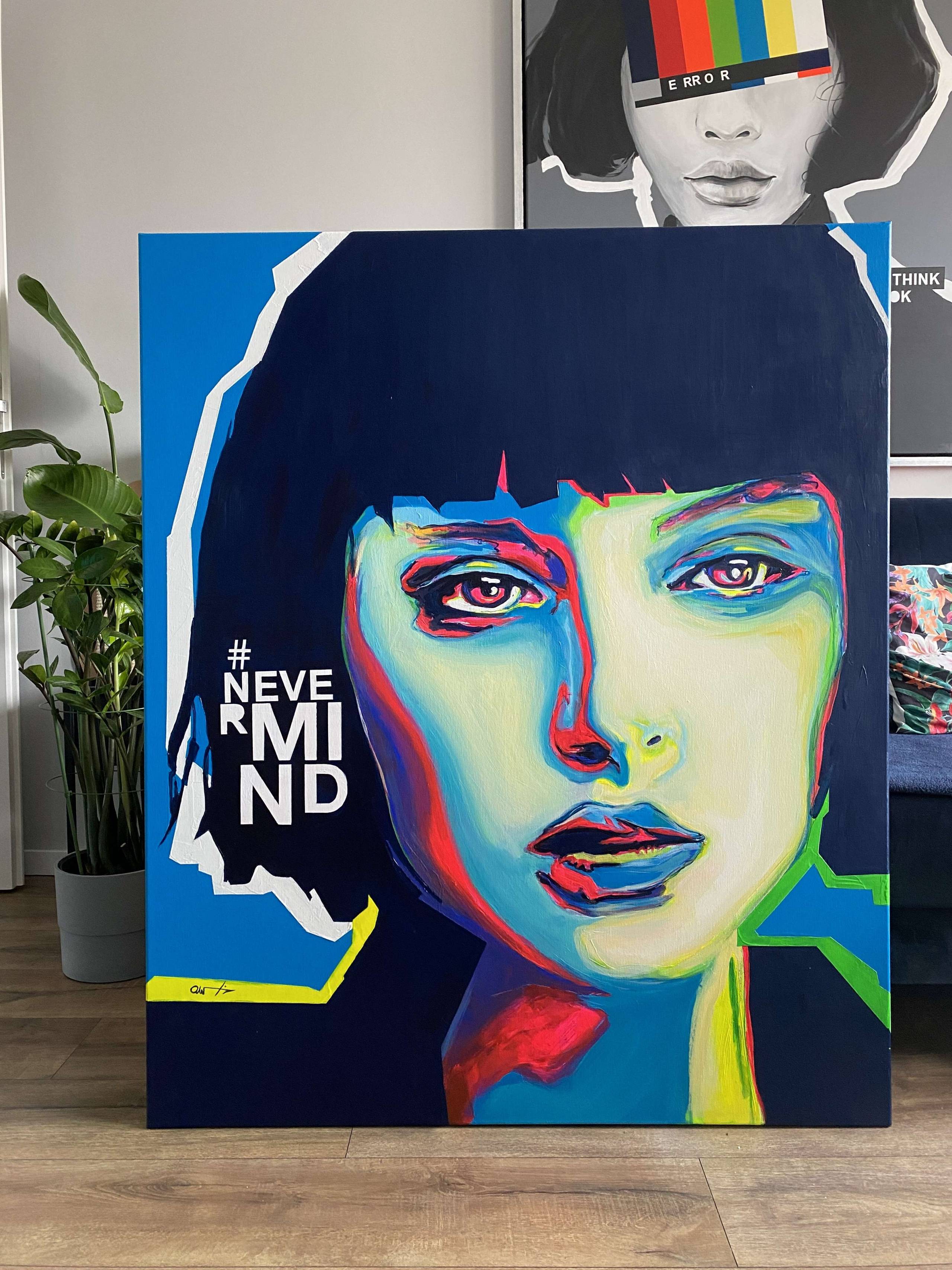 Title: #neverMind Series: Neon Face Dimensions: 120 cm x 100 cm Acrylic on canvas Year: 2022 Signed painting + certificate of authenticity The edges of the painting are painted. No framing required. The colors in the painting are vivid and have greater depth in real life than in the photo.