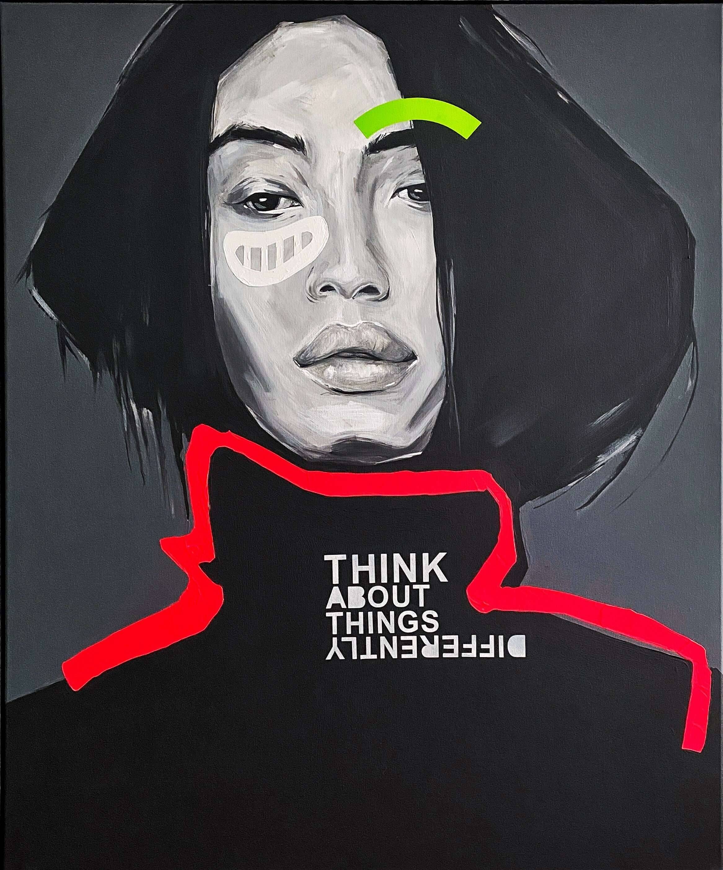 Title: Think different Series: Error Face Dimensions: 120cm x 100cm Acrylic painting, canvas Year: 2022 The painting is signed; includes a certificate of authenticity. The painting has painted edges. It does not require framing. In person, the colors are vivid and have greater depth than in the photo.