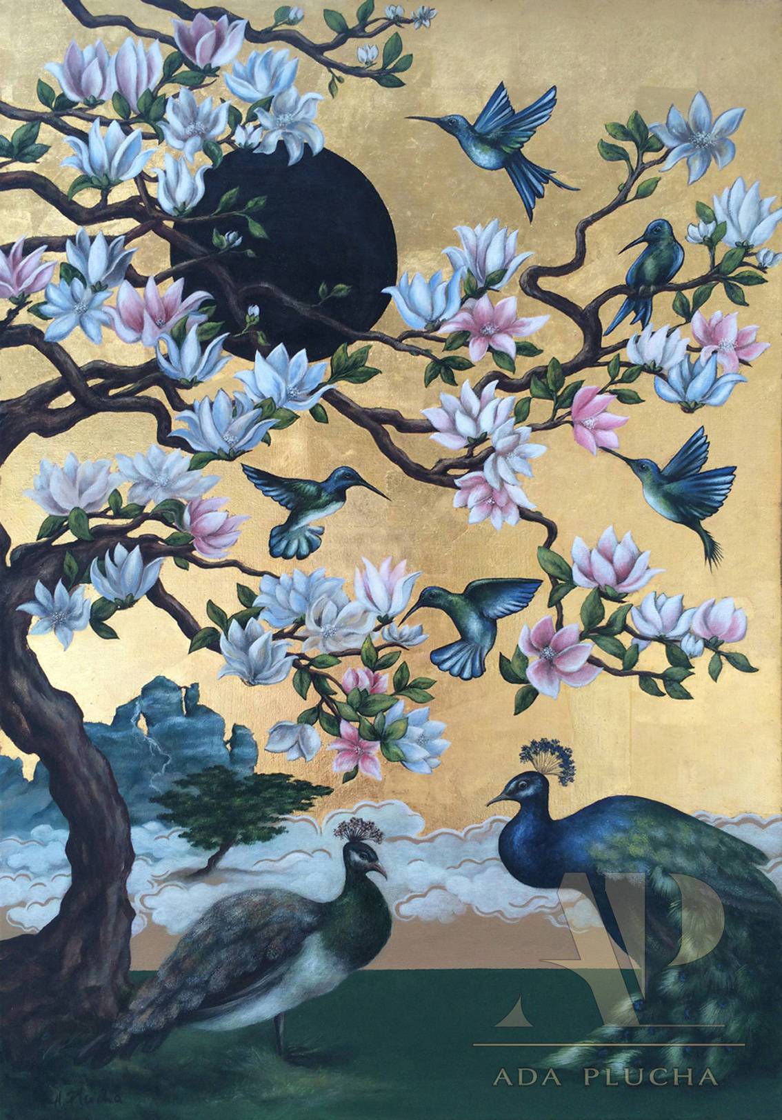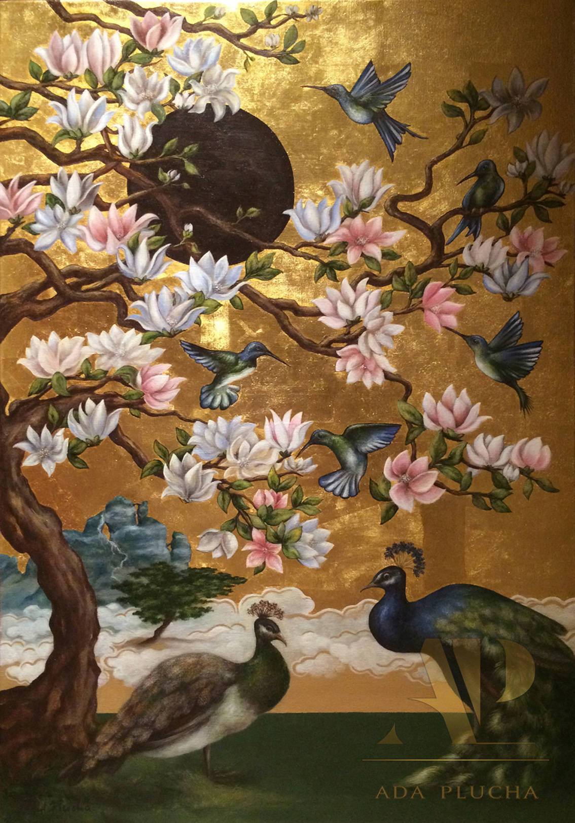 ''The Obsidian Sun" from the ''The Gardens of the World – Asia" collection. Gold 23.75 ct., my own technique, 70x100 cm, 2016-2017.