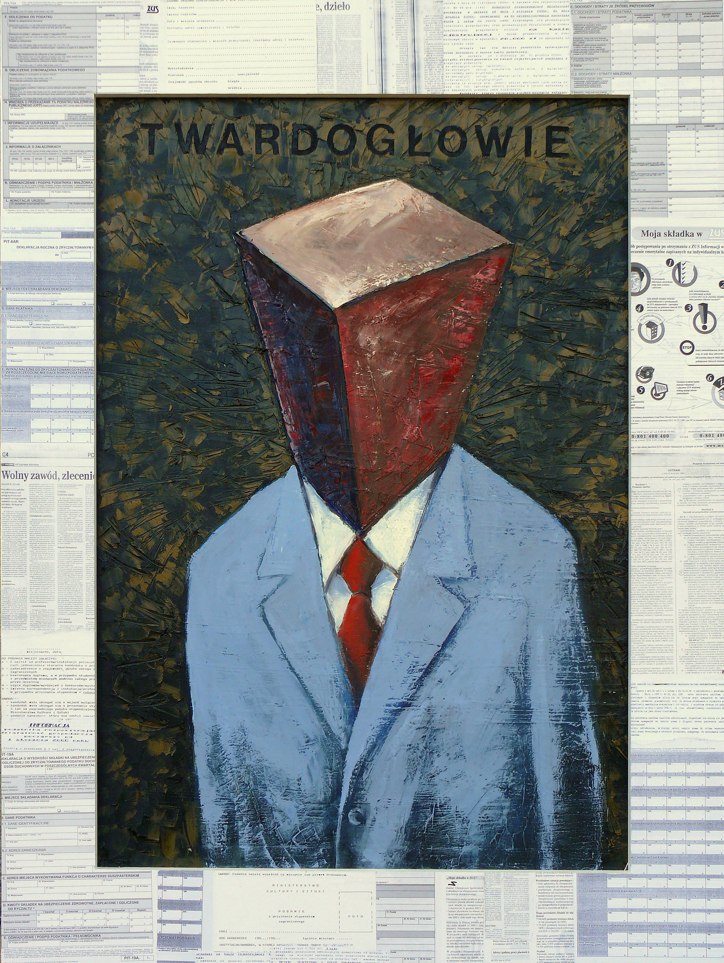 The painting depicts a figure with a cuboid-shaped head, dressed in an elegant blue suit and a red tie. The background is a chaotic composition, full of intricate patterns and dark colors, which creates an oppressive atmosphere. Around the central figure we see something resembling documents, lending the work a surreal character. There is a palpable note of absurdity and a tendency toward exaggeration. The painterly texture underscores the stiffness and impersonal aspect of this figure. The artist employed impasto techniques, which add structure and depth to the painting. This evokes mixed emotions in the viewer, from fascination to fear. It may prompt reflection on conformity and the powerlessness of the individual in the face of bureaucracy. One of those paintings that stays with you for a long time. Looking at it, it’s easy to imagine a child saying, "Why is his head so strange?" And that’s the moment when you feel the work says more than you see at first glance. The piece sort of hypnotizes you, forces you to reflect - you can't ignore it. The contrast between the human silhouette and the inhuman geometry of the head is fascinating, too. It’s like a metaphor for a technologized world. In sum, the painting exudes a strange yet intriguing allure.
