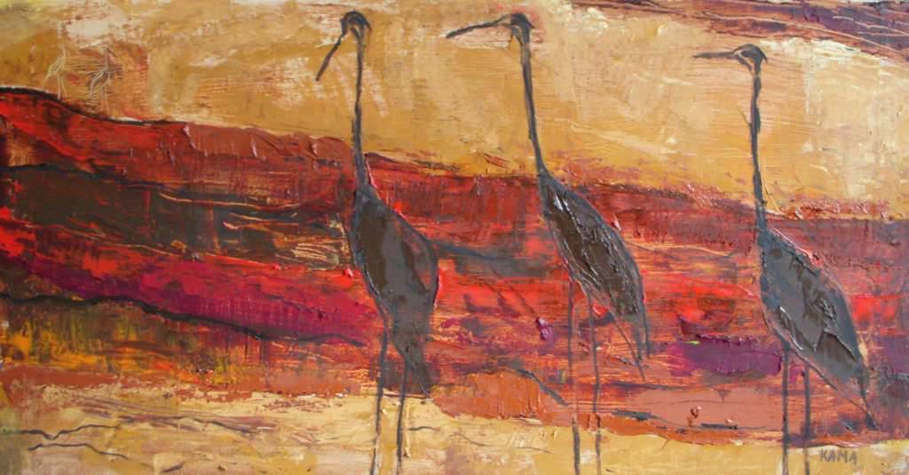 The painting depicts three slender silhouettes of birds standing against a backdrop of colors brimming with contrast and radiance. Warm shades of yellow, browns, and reds dominate, flowing seamlessly into one another to create a dynamic, almost living composition. The birds, like silent guardians of time, lift their long necks toward the sky, and their shadows lend an air of mystery to the entire piece. The mood of the painting is intriguing, somewhat nostalgic, yet imbued with calm. The artist’s style is distinctive. They used thickly applied layers of paint, which impart texture and depth. Such impastos emphasize the power of the colors and amplify their emotional charge. The viewer feels as if they could almost touch the surface of the painting and sense every brushstroke. This evokes a sense of warmth and the fleeting nature of the moment, and perhaps even awe at nature as it reveals its strength. Wow, what cool birds! The painting virtually invites reflection and a moment of contemplation. It is an ideal blend of energy and subtlety, where every color has its place and every shape its meaning. A single glance is enough to feel the magic contained in these simple yet powerful elements.