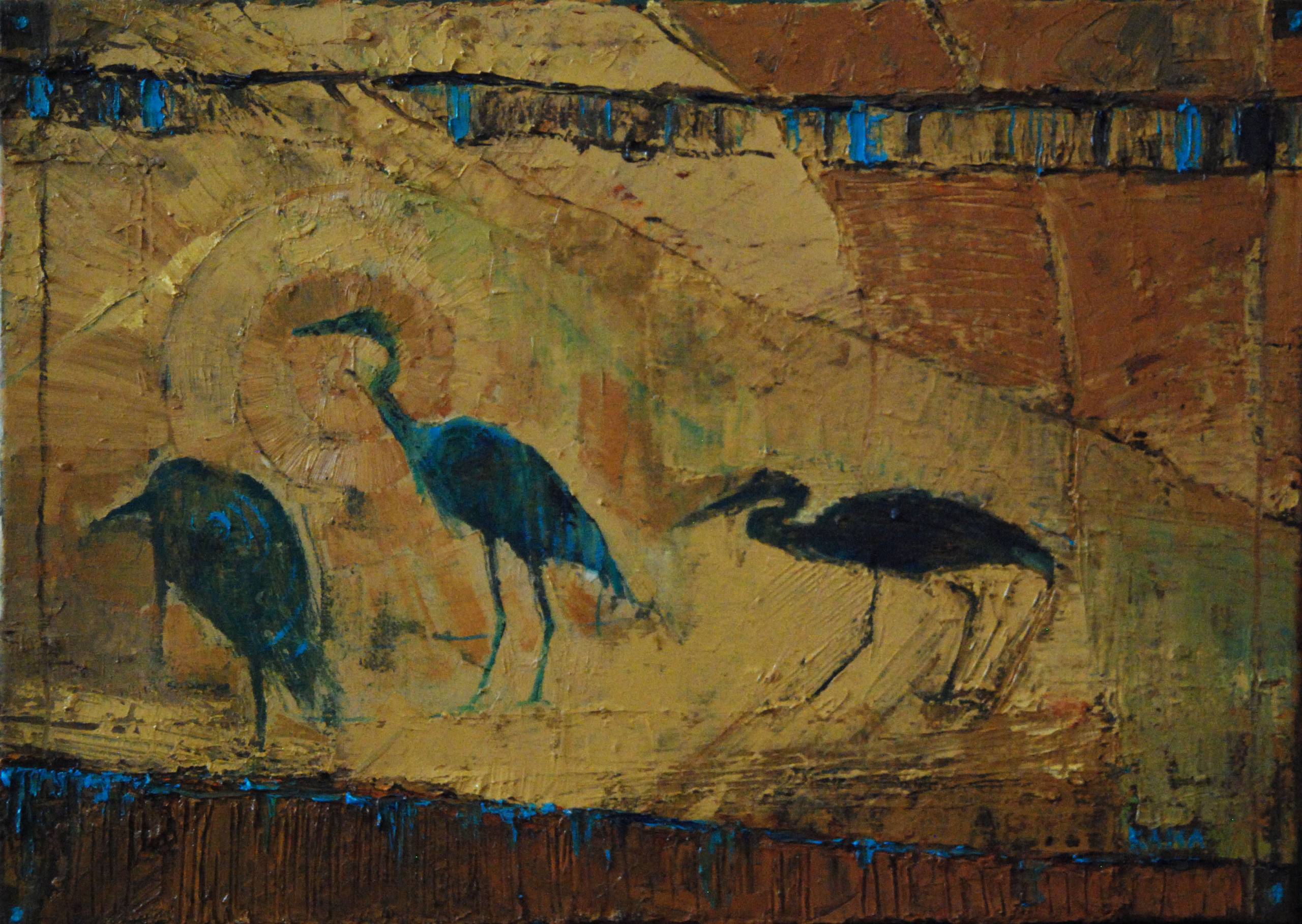 The painting is dominated by earthy, warm colors—browns and golden tones—that create a backdrop for three bird silhouettes. The central part depicts birds in mysterious, navy-blue forms, surrounded by a slightly lighter glow. The composition is harmonious yet engaging. It gives the impression of a journey through time, as if we were looking at ancient hieroglyphs. The painting’s atmosphere is calm and meditative, as though frozen in a magical moment. The artist used the impasto technique, where thick layers of paint add texture and depth. This style gives the work a unique, esoteric look. The painting provokes reflection on nature and the power of time. It can evoke a longing for a place that exists only in the imagination. It looks cool. To me, it’s like a snapshot from another world, something like a dreamlike frame from a forgotten film. Interestingly, it has a certain nonchalance and a laid-back vibe that makes the viewer feel at ease. Looking at this painting, one might wonder what these birds symbolize—perhaps freedom, or maybe something more elusive? Its graphic simplicity and deep, saturated colors leave room for individual interpretation and emotional engagement.