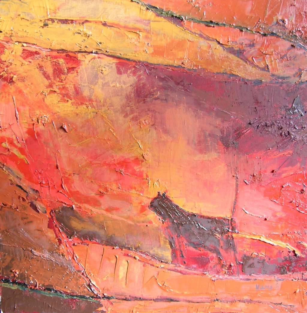 The painting is dominated by intense shades of orange and red that seem to dance across the canvas in a melancholy harmony. Rough, impasto brushstrokes form dynamic shapes, recalling a landscape at dusk. The composition is somewhat chaotic, yet it intriguingly draws the eye, leading it toward a darker element at the center that may be a figure or a shadow. The mood of the painting is at once warm and comforting, yet also mysterious and slightly melancholic. The artistic technique the creator employed is likely impasto, which adds texture and depth to the piece. Thick layers of paint create a sense of three-dimensionality that underscores the composition’s emotionality. The painting may evoke feelings of calm, but also a certain reflectiveness about impermanence. It could be a “worth seeing” scene of following one’s own shadow. It is somewhat reminiscent of a fairy tale in which a fox runs across the desert. One might feel that the artist is subtly trying to portray the passage between day and night, life and dream. The painting invites reflection on nature and its constant transformations. You feel as if you are looking at a record drawn from the depths of the soul. The harmonious palette and the blend of rawness with delicacy make you feel as though you were on a walk through a surreal landscape. What you see is not only color and shape, but true, authentic emotions flowing straight from the artist’s heart.