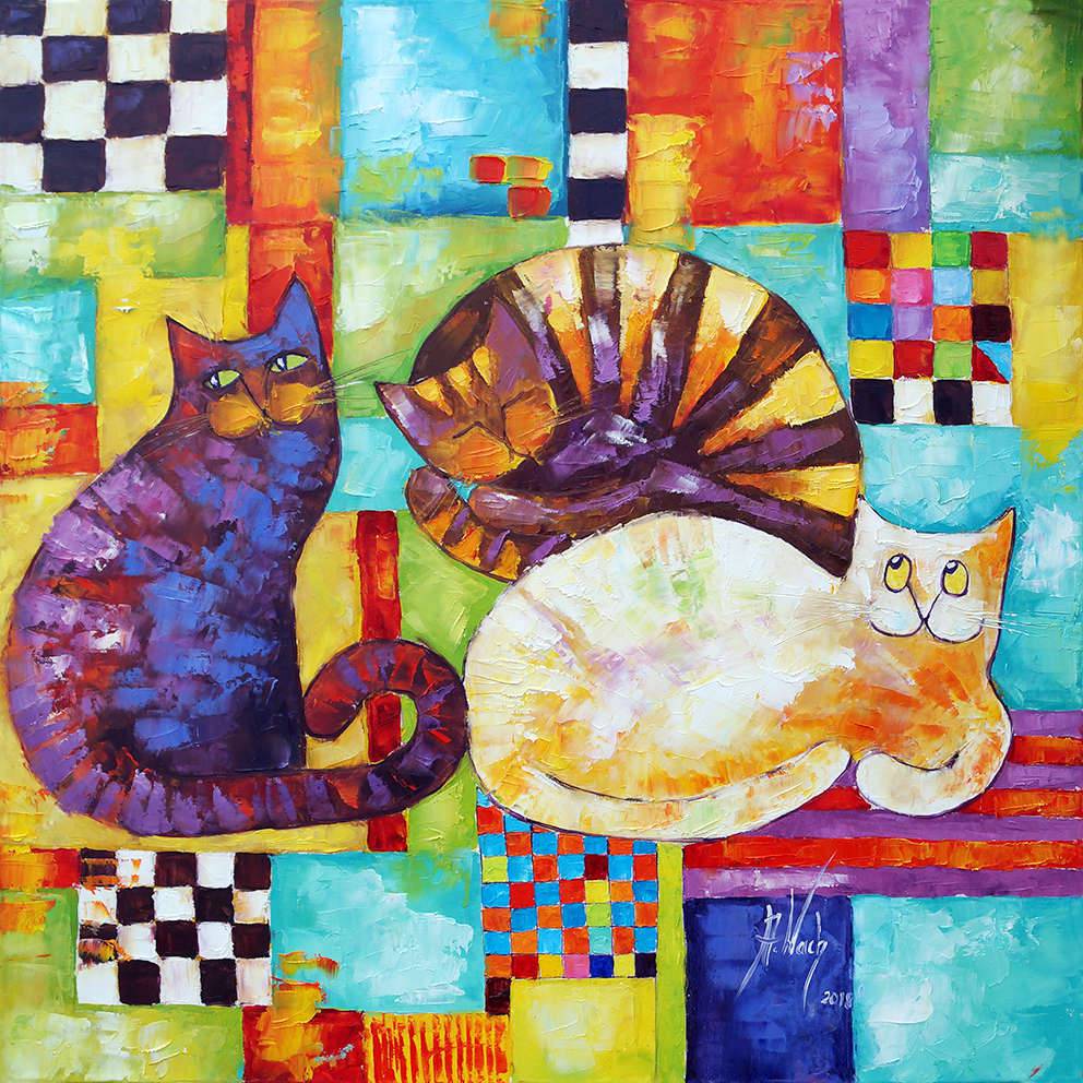 An oil painting executed with the palette knife technique, depicting three adorable cats lounging on a colorful sofa.