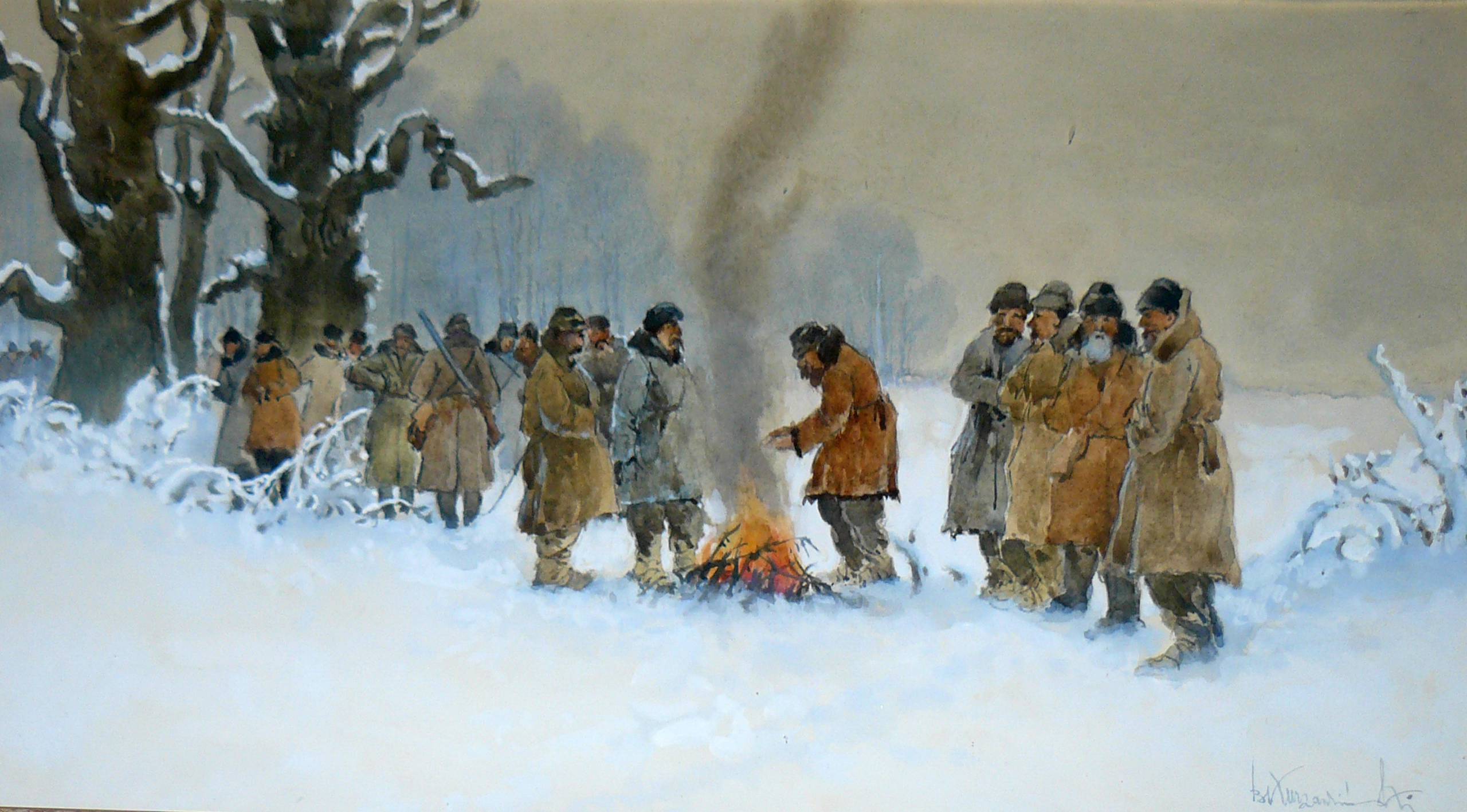 The painting shows a group of people surrounding a campfire in a winter landscape. The white of the snow contrasts with the warm brown-gray colors of their clothing. In the background, you can see misty trees that add depth and melancholic mood to the landscape. The artist used watercolor, which allows for delicate color transitions, reflecting the severity of winter. Puffs of smoke rising from the campfire introduce a dynamic element, enlivening the static scene. The mood of the painting is both melancholic and full of community. You can feel the cold radiating from the painting, while at the same time noticing the warmth and sense of unity emanating from the characters. This is a moment when a person struggles with nature, but also finds comfort in another person. The artist skillfully captured a moment full of reflection and hope. Looking at the painting, you can feel nostalgic. It is as if the artist wanted to say "together we can overcome anything". Although there is a note of sadness somewhere, the campfire symbolizes hope and warmth. I think to myself that maybe they are dreaming of spring. My friend says that this painting is like a promise of better days. There is something about it that reminds me of the stories my grandparents told me about difficult times, but also how important relationships were.