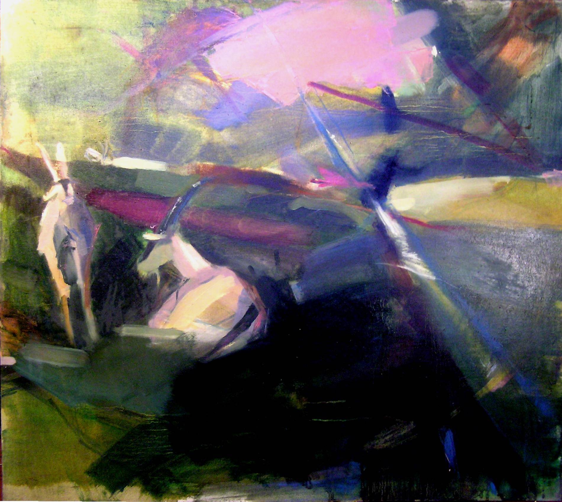 The painting emanates a mysterious and slightly abstract atmosphere. Intense shades of green, purple, and pink create a dynamic composition full of movement. The colors seem to be in an eternal struggle, intertwining and permeating one another. The artist has employed abstract painting techniques, deftly using broad brushstrokes that lend the work a sense of fluidity. Looking at the painting, we may feel a certain disorientation, as if we were drawn into another world filled with both chaos and harmony. I imagine that what we see is a slowly unfolding story that each person can read in their own way. Perhaps it’s a bird flying into the unknown, or wild nature in the murky light of morning. Children sometimes say, “It looks like a computer game!” and they’re right. Wow, such a painting is a real roller coaster of emotions. On the one hand, the beauty of abstraction; on the other, unease and fascination. Isn’t that intriguing? The painting catches the eye and invites you into the depths of its ambiguous layers. Those intersecting lines—they say something like “explore.” Everyone can interpret this painting differently; everyone can find their own world in it.
