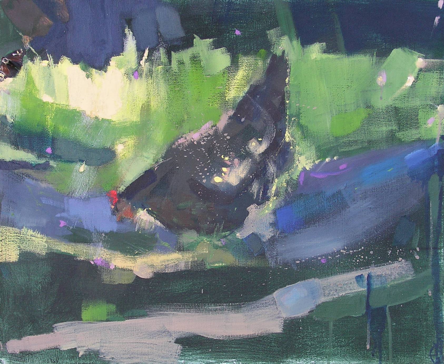 The painting is full of vivid colors that mesmerize and draw the eye. Shades of green and blue predominate, intertwining in a harmonious way. Each brushstroke is confident yet delicate, forming a somewhat abstract composition. The central element is a dark, bell-like figure that evokes something mysterious and magical. The painting has this vibe of calm and stillness, as if we were in some kind of magical garden. The artist employed techniques typical of Impressionism, with an emphasis on expression and the play of light. We see spontaneous, swift brushstrokes here, as if each of them had its own story to tell. All this together creates a sense of lightness and the fleeting nature of the moment. The painting may evoke in the viewer emotions connected with adventure and the discovery of nature’s hidden nooks. You can feel a subtle breeze and the sun filtering through the leaves of the trees. Oh, how nice it would be to be there. For me, it’s like a dream of a perfect day in the park. It brings to mind childhood memories, when everything seemed much bigger and more interesting. Do you also see any elves there? I do!