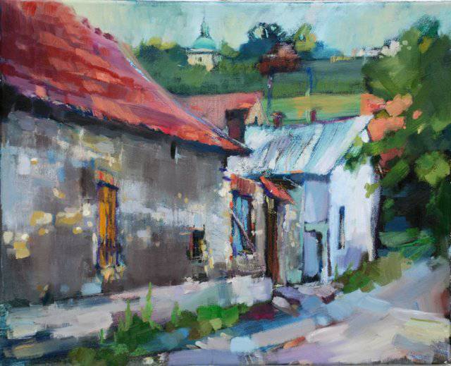 In the painting we see a rural landscape with two old buildings that seem to be at the heart of a peaceful village. A rich color palette is used here. Shades of green mingle with the reds of the roofs and the neutral tones of the buildings’ walls. All of this harmonizes surprisingly well and creates a cohesive composition. The landscape seems frozen in time, exuding nostalgia and calm. The painter opted for an impressionistic approach. The brushwork is dynamic, evident in the paint strokes and irregular contours. The painting is full of life, even though it depicts an apparently static scene. It’s something beautiful and cozy, those “homey vibes.” Looking at it, I feel like I’m on vacation at my grandparents’. It evokes a sense of warmth and safety. The way shadows and light are rendered makes each viewing intriguing. It feels as if everything pulses with a lazy summer afternoon. Hey, there’s a cow! Personal reflections mingle here with simple admiration for the artistic technique. Simply an excellent impression.