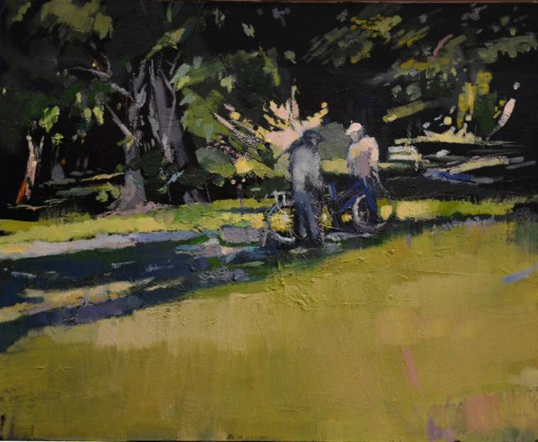 The painting depicts two figures amid lush greenery, bathed in shadow and light. Sunlight filters through the leaves of the trees, creating dappled patterns of light on the ground. This contrasting composition, dominated by deep greens and shades of yellow, gives the work a truly summery mood. The atmosphere is calm yet full of life. A kind of “lazy afternoon,” right? The artist used loose brushstrokes; the impasto technique adds texture to the painting, intensifying the sense of naturalness and dynamism. The painting may evoke mixed emotions in the viewer. It is a nostalgic journey to lazily spent summer days in the park. It may bring back memories of walks with loved ones. The radiance and shadows create a mysterious aura, as if we were dealing with a sweet secret seen only by the painting’s protagonists. “I want to go to the park with my bike too!” a child would write, looking at this painting. For me, personally, it’s a little “escape” from everyday life—perhaps even the beginning of a story one could write oneself. And you? What do you notice in this idyllic setting? It’s such a peaceful place, where time seems to slow down. The painting brings calm and, at the same time, gladdens the heart.