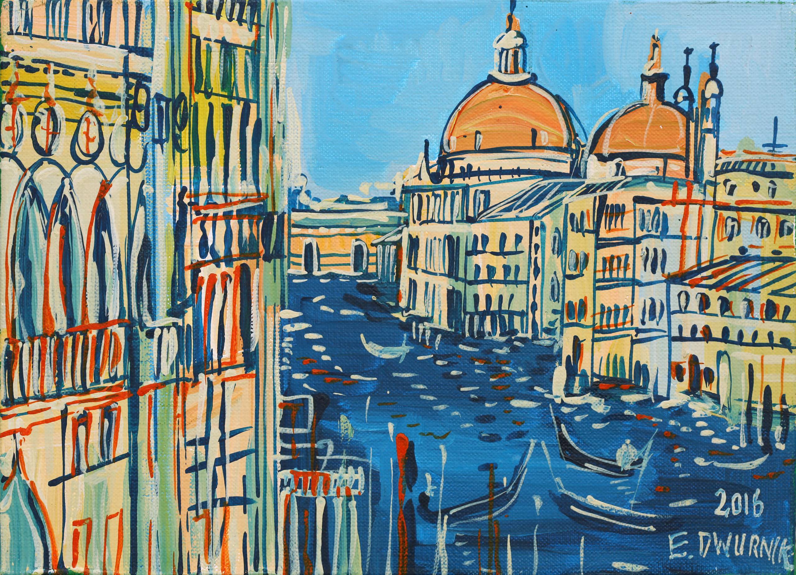 The painting depicts a charming city dominated by intense shades of blue and orange. The warm colors of the houses contrast with the cool, deep blue of the water, making the scene seem very dynamic. The shapes of the buildings are geometric, with clear lines, which gives them a slightly modern character. The composition is balanced, mainly due to the presence of large domes and vertical architectural elements.