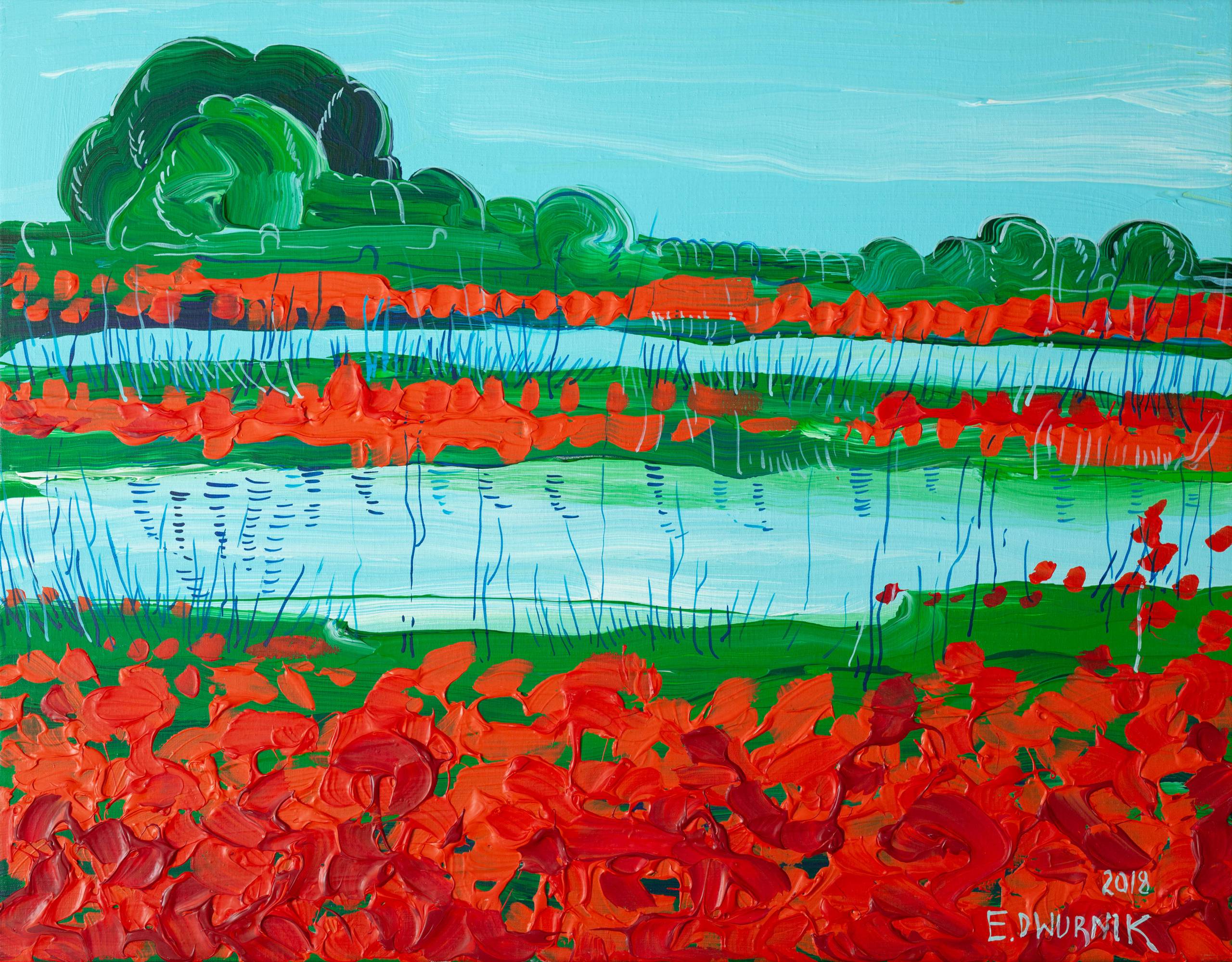 The painting is dominated by intense green and red colors that simply scream from the canvas. Green trees and hills create a harmonious horizon line, while the red poppies reign in the foreground, almost coming out of the frame of the painting. The artist applied the paint with a flourish, giving the composition a dynamic rhythm. The painting emanates energy and joy, as if inviting you to a world full of passion. The impressionist style is noticeable in it, and at the same time the technique of painting with a thick layer of paint adds to its uniqueness.