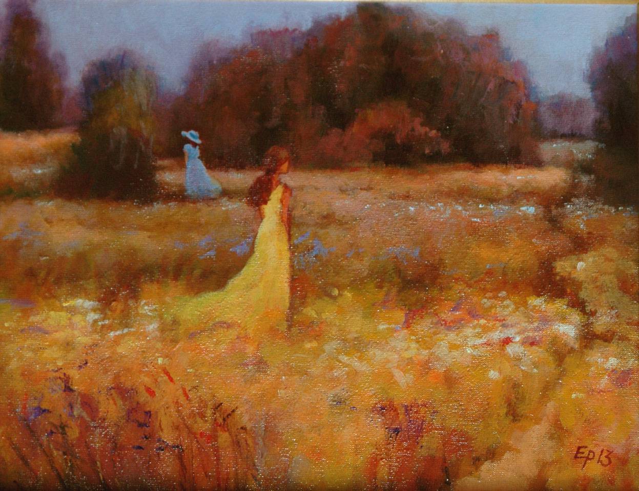 The painting depicts a magical landscape of a southern field in the rays of the setting sun. Two figures are clearly visible here, one in a white dress and hat, and the other in a vivid yellow creation. The whole thing shimmers with warm shades of gold, orange and brown, which intertwine with cool accents of blue and purple on the horizon. The composition is dynamic, but at the same time gives a feeling of peace, as if time had slowed down just for a moment. The atmosphere of the painting vibrates with the subtle charm of a summer afternoon. There is something mysterious, almost melancholic here, which attracts the eye and the heart. The painting technique is characterized by an impressionistic approach to nature, showing the world in shimmering patches of color, where details fade into the background. This style makes you almost feel the gentle wind and the warmth of the sun on your own skin. Looking at this work, it is easy to fall into reverie. Maybe an old memory, maybe a dream appears for a moment. Children would probably say - "Oh! There, grandma and mom!” – simply expressing what everyone feels. This nostalgia for a moment that will never return, but remains forever in the heart. These are such "dreams" and moving. The image reminds us to savor every moment.