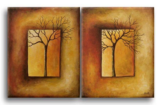 The painting depicts two rectangular canvases featuring mysterious trees. The dominant colors are warm shades of brown, orange, and beige. The first thing that catches the eye is the contrast between the stark tree branches and the subtle, golden backgrounds. The trees seem almost engraved into the backdrop, creating a sense of depth and space. The composition is simple, almost symmetrical, yet full of expression. The atmosphere of this work is calm, slightly melancholic. One can feel a gentle nostalgia, looking at those bare branches and wondering what might have been. The technique used by the artist can be described as a blend of realism and impressionism, which gives the painting a somewhat surprising twist. When I look at it, I feel something stir within me. Perhaps it’s memories of autumn, when the wind was warm and the leaves still hung on the trees. “The tree looks like the handle of an icicle”—that’s probably what a child would say. The painting strikes an emotional chord, prompting reflection on impermanence. Or maybe it’s just a moment of calm amid the chaos of everyday life. Love how the colors blend. This work can be rediscovered endlessly, each time revealing different emotions and subtleties.