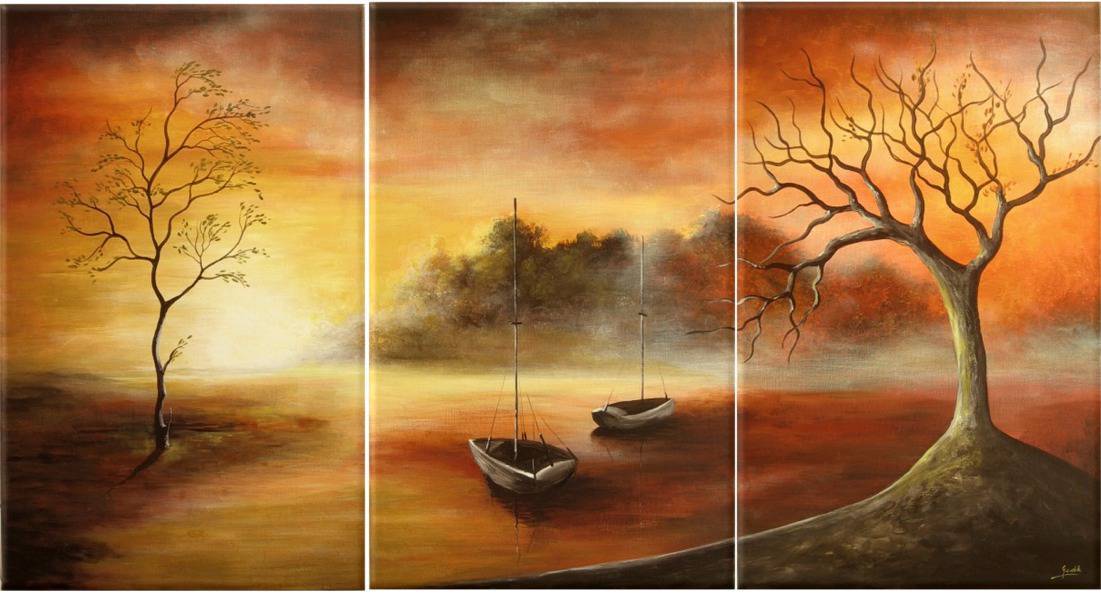 The painting consists of three panels that together create a tranquil, melancholic landscape. Warm shades of orange, gold, and brown dominate, transitioning into more subdued browns and gray. In the foreground we see two trees—one on the left, the other on the right—stretching their branches toward the sky, giving the scene a delicate, organic character. Between the trees, two boats float lazily, seeming to drift on the still surface of the water. The atmosphere of the painting is exceptionally calm and contemplative. Looking at this scene brings to mind introspection and an escape from the bustle of the world. The artist used soft brushstrokes, which strongly emphasize the gentleness and harmony of the composition. The use of gradients in the color palette adds depth and dynamism, despite the static nature of the elements. Viewing this painting, one can feel a certain longing and nostalgia, as if it were inviting us to a brief moment of reflection. Sometimes, for me personally, such images remind me of time spent in the countryside. This place is like a magical world, that's all. Perhaps that is what makes everyone dream of a moment of respite in a similar setting, where nothing intrudes and one can simply be.