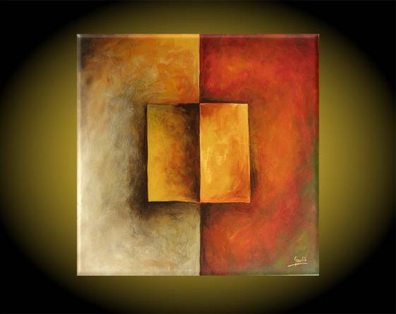 At first glance, the painting draws attention with its warm color palette - shades of gold, orange, and deep red. Geometric shapes merge smoothly into a harmonious composition, centered around a rectangular form. This arrangement lends the work a minimalist yet intense character. The background emanates a mysterious depth, as if the painting were whispering its own stories. The mood of the painting is calm, yet filled with the warmth of a setting sun. One feels a nostalgia for something undefined here. It is a bit like coming home after a long journey. The artistic style recalls abstract expressionism, though with a clear emphasis on the geometric treatment of forms. The painting technique is subtle, with gentle tonal transitions and delicately applied layers of paint. The work can evoke a range of emotions - from calm to a slight unease. Who knows what the artist wanted to convey to us? Perhaps it is a matter of seeking balance in chaos. Or maybe it is about something else entirely? It's up to you. For a 7-year-old child, this painting might simply be "a golden square on fire." Looking at it, I feel it is like a melancholic melody that will not leave my thoughts all day. The painting provokes reflection, as if asking: what else is hidden in that mysterious depth?