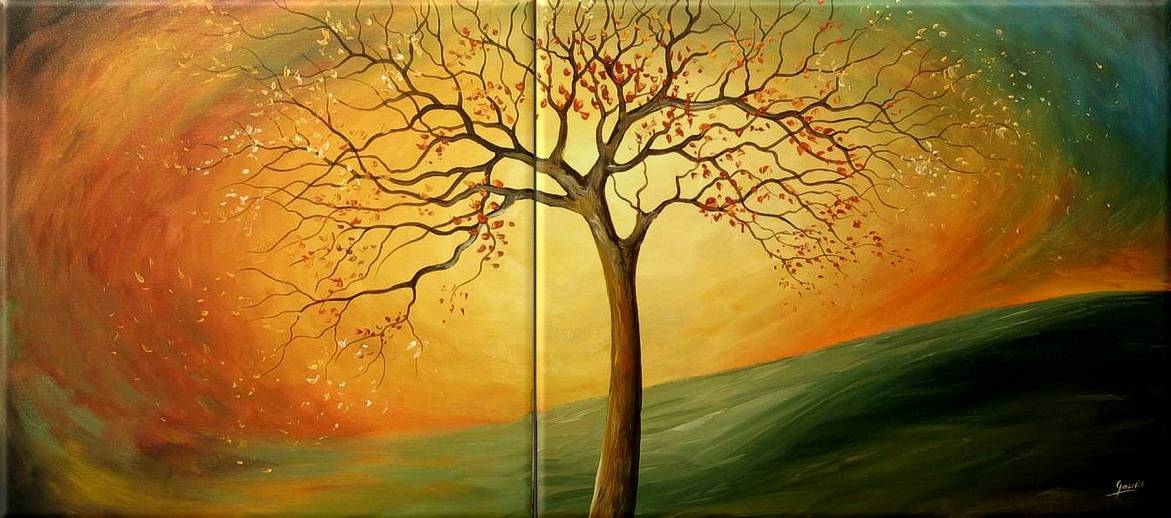The painting depicts a solitary tree against a magical sky full of warm colors. Shades of orange, gold, and green dominate, creating a harmonious composition. The tree’s branches are gently curved, as if dancing in the wind, and the tiny leaves shimmer like little jewels. The scene conveys nostalgia and calm, while also a spark of mystery. The mood can be described in one word: enchanted. The artist’s style seems to flirt with Impressionism, thanks to loose brushstrokes and fluid transitions of color. The piece brings back memories of summer evenings, when everything seems possible. “This tree is magical and has secrets,” a 7-year-old would say. The painting invites reflection on the cycle of life, impermanence, and the beauty of nature. Looking at this work, I feel a surge of warmth and peace, as if the world had paused for a moment in awe of beauty.