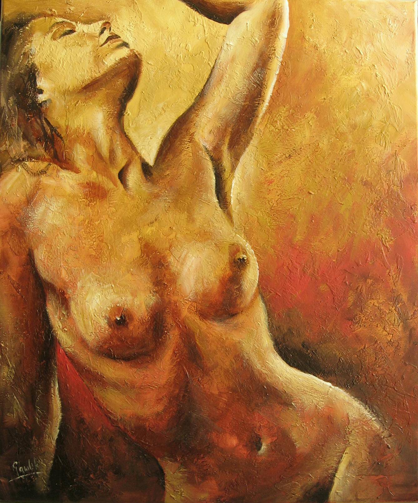 The painting is a true work of art. It is dominated by a gold-brown palette that evokes warmth and tranquility. There is a human figure, captured in the half-light, as if in a moment of rapture or deep contemplation. The forms are soft and fluid, and the brushstrokes give everything texture and depth. The atmosphere feels remarkably intimate and focused; you can almost feel the touch of light brushing the skin. The style in which the painting was executed may recall Impressionism, but with a touch of expressiveness that shouts “Look at me!” The artist used thickly applied paint, which beautifully conveys dynamism and movement. Looking at this piece, one can feel a certain nostalgia, as if the figure reminded us of something familiar yet long forgotten. The painting certainly stirs emotions, from calm to subtle melancholy. “This is a woman, like mom,” a child would say, looking at the delicate form. Personally, it reminded me of summer days and warm sunlight on the skin. The work invites you to pause for a moment and immerse yourself in the warm, enveloping atmosphere that emanates from the canvas.