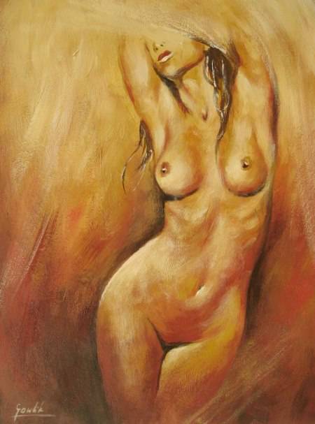The painting radiates warmth and subtle sensuality. Shades of gold, amber, and brown dominate, harmoniously forming soft, flowing lines that depict a female figure. The body, shown in a dynamic pose, seems to breathe with a life of its own, while an aura of mystery surrounds it. The viewer looks on without seeing the face, which lends the composition an air of intrigue and mystery. The artist has used delicate brushstrokes that give the whole a slightly impressionistic character. This painting does not shout, it whispers. The use of light and shadow allows the figure to gently emerge from the background, as if immersed in the golden light of morning. It evokes emotions tied to beauty and intimacy, perhaps even a longing for a lost moment. When one gets up in the morning and looks in the mirror, one feels the same. The painting may draw attention with its simplicity and naturalness. One might think of the delicate beauty of nature that the artist wanted to capture. The way the female body is presented, with an emphasis on its form, inspires admiration and respect for artistic mastery. It is a work that makes you feel like starting to dance somewhere deep inside.