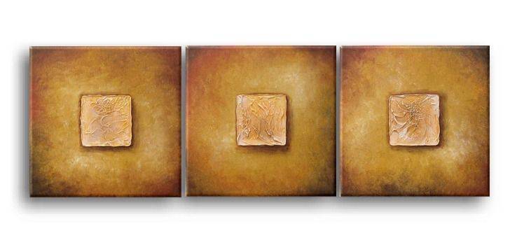 The painting consists of three panels that form a harmonious whole. Each has a centrally placed square with a textured surface, which adds depth to the piece. The background is in warm shades of brown and gold that exude calm and warmth, though there is something mysterious about them. When you look at these squares, you notice their solidity contrasting with the blurred background. It looks a bit as if someone took a piece of nature and rendered it on canvas. The composition is symmetrical, which gives it a sense of balance and stability. The mood of the painting is soothing and meditative. It brings to mind a warm summer evening when everything slows down. The artist used the impasto technique, evident in the thick application of paint, as well as color accents that extend beyond the boundaries of the background. This adds dynamism to the piece despite its subtle simplicity. It evokes a sense of calm, yet also intrigues with its texture. The painting evokes various emotions. It may prompt the reflection that sometimes very little is needed for something to become beautiful. A child might say, “It looks like slices of cake!” The artist’s style, though minimalist, has something magical about it. Some element of this painting is simply magic. Gentle color transitions and the use of light create a mysterious atmosphere that encourages you to pause for a moment and sense what is invisible to the naked eye.