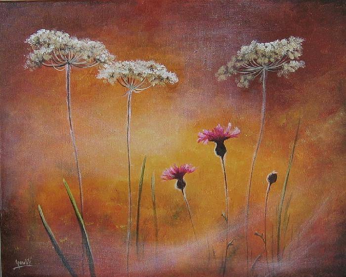In the painting we see delicate flowers floating against the backdrop of a warm, setting sun. The colors are as if painted with gold and copper, creating an atmosphere of evening calm and quiet. Delicate white umbels and pink petals nestle together, as if dancing in the wind. The shapes of the plants are slender and ethereal, almost magical, and the composition of the painting feels considered, yet natural. The mood of the painting is calm, almost dreamy. Looking at it, you can feel the warmth of the sun’s rays on your face and the faint buzzing of insects somewhere in the background. The artist used subtle brushstrokes to convey the flowers’ delicacy, and the background is full of soft gradations of color. The technique is truly masterful. The painting evokes a sense of nostalgia and solace. It may bring to mind childhood summers. Mom, look, pretty flowers! It certainly leaves room for personal interpretations and reflections. The atmosphere is "peaceful," almost meditative. For me, it is like a brief escape to a realm of tranquility.
