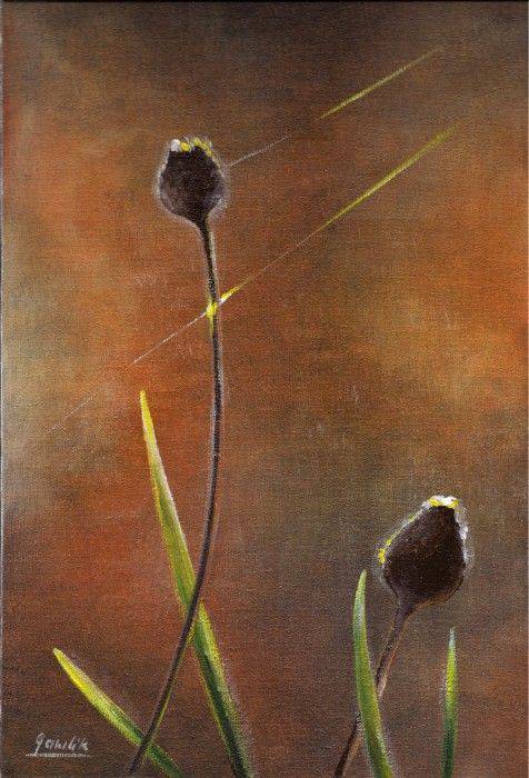 The painting emanates warmth and tranquility. Browns and greens dominate, gently blending into one another to create a harmonious composition. Slender plant stems, capped with buds in dark tones, subtly dominate the background. The artist has employed a painterly technique that lends a delicate texture to the whole, adding a striking, almost magical light. Perhaps even a touch of mystery. It is a world where green intertwines with shadow, and warm hues embrace a cool chill. Looking at the painting, we feel as though we are in an autumn garden, where time flows slowly and every second is like a golden leaf falling from a tree. Children might say, “It’s like a fairy tale from an enchanted forest!” There is something nostalgic here, something that reminds us of the changing seasons. Paintings like this can awaken a range of emotions in us—from serenity to a gentle longing. The artist plays with light in a masterful way, creating subtle highlights that catch the eye and guide the gaze through the composition. It’s as if every detail had a little story to tell. This painting is a reflection of nature's elegance — capturing the essence of momentary beauty. It evokes the feeling of standing on the border between dream and reality, as if we were whisked away for a few seconds from the everyday world into a realm full of magic.