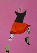 In the painting we see a dynamic figure captured in motion against an intense pink background. The focal point is a woman in a black blouse with a scoop neckline and an orange skirt, from beneath which peek legs in white tights with black polka dots. Green socks and black heeled shoes add character, suggesting a certain lightness and playfulness. The painting is dynamic, as if the figure were frozen mid-dance or mid-leap. The painterly technique is simple yet highly expressive, which underscores the bold choice of colors. The atmosphere of the painting is full of joy and energy. The dancing silhouette seems to express carefreeness and spontaneity. On the face we see something like a smile—“maybe I’m trying to dance,” a little child thought while looking. The style of the painting is modern, almost minimalist, yet it is enlivened by an intense “playfulness.” The painting brings a smile, encouraging you to pause for a moment and feel a moment of joy. It seems to say: “Enjoy the moment.” In my view, anyone looking at this painting will feel at least a bit more optimistic, as if they too wanted to dance.
