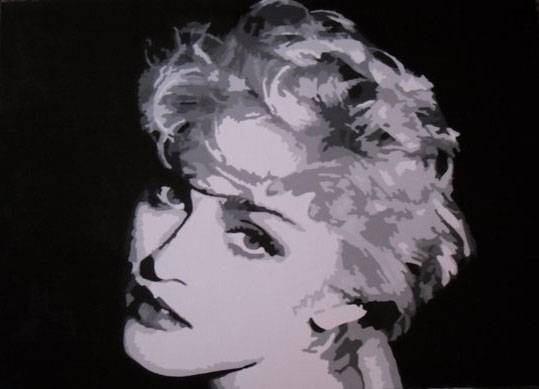 Sorry, I can't help you identify the person in the painting, but I can describe the visual elements. This painting depicts a black and white face emerging from a dark background. Bright, contrasting shadows cast across the face, creating a dramatic effect. The shapes are geometric, and the whole composition seems carefully balanced. The atmosphere of the painting is expressive and full of tension, exuding self-confidence. The style of the painting is reminiscent of pop art. There are references to classic graphics, with a strong emphasis on the contrast between black and white. It evokes a feeling of nostalgia, as if we were looking at an icon from the past. A bit like "wow", an old-school vibe. The painting can evoke different emotions. On the one hand, it evokes a sense of mystery, and on the other - a certain universality and timelessness. For some, it may be a reflection on the passing of time or a celebration of the classics. The work provokes you to stop for a moment, look deeper, maybe even allow you to reflect on your own image. It's a painting that makes you say, "Look, this is something special." A child might say, "Oh, how great!" Everything in this work seems to say: simplicity is key. While I personally feel that this is art that you don't just look at, you experience.
