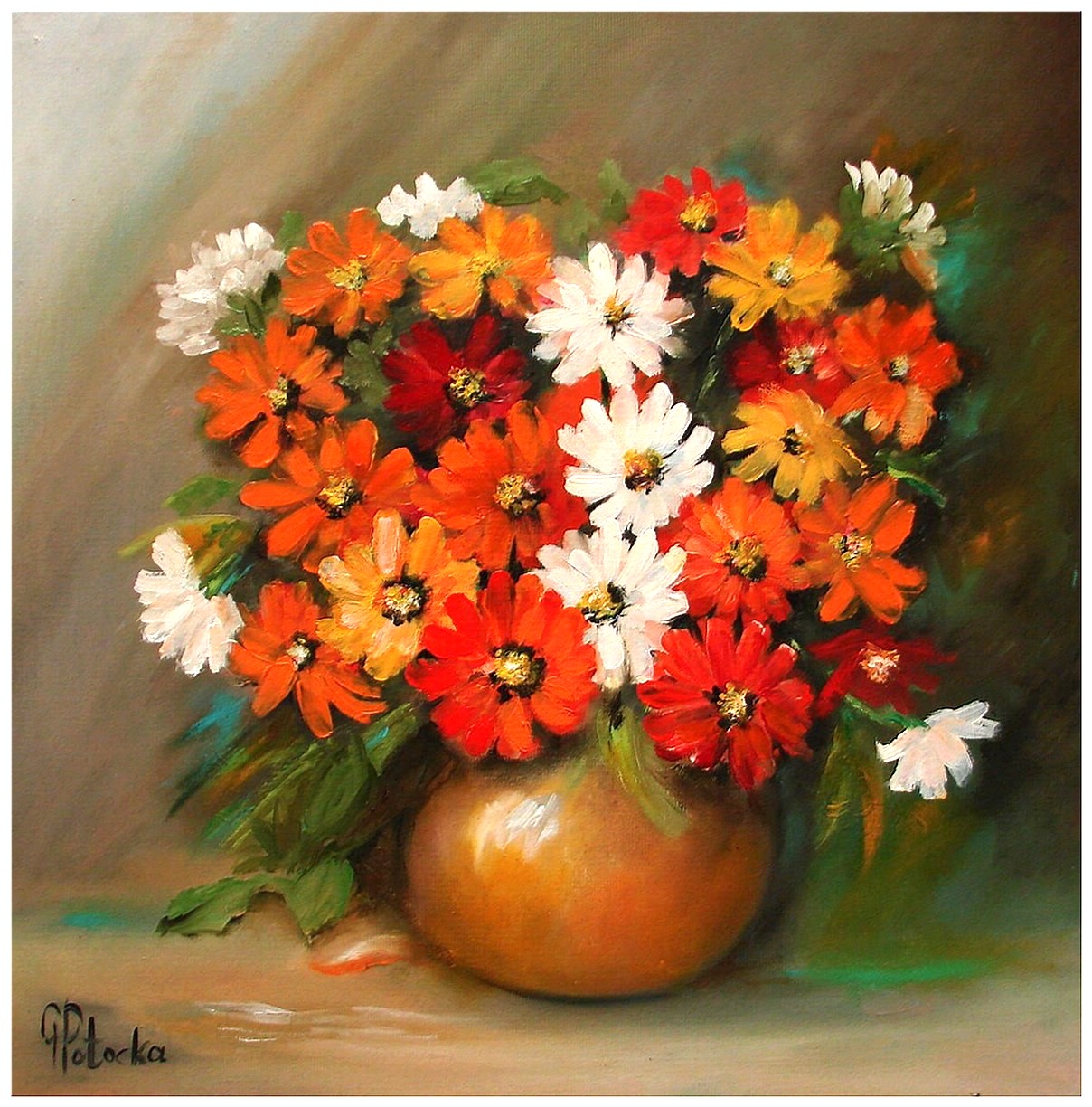 Grażyna Potocka - Oil painting ZINNIAS 50cm-50cm