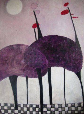 The painting is full of unusual shapes and intriguing colors. Deep purple dominates, blending with delicate pink and white spaces to create a dynamic composition. Slender black lines rise upward like tree branches, with intense red dots at their tips tempting the eye. This painting has a dreamscape feel. The painting's surface resembles suede, or perhaps even something more cosmic. There's a touch of mystery here. This style is quite abstract, rather surreal. The artist plays with various techniques, exploiting texture and color contrast. Is this a dream or another dimension? A child might say these are trees from Mars! The reaction to this painting might be surprise, a hint of a smile, or nostalgia. It's a bit like putting a puzzle together in your head. It would make a great landscape painting for an album cover. Personally, I'm intrigued. Today's word: mystery. The form of the painting lulls the viewer into a state of contemplation.