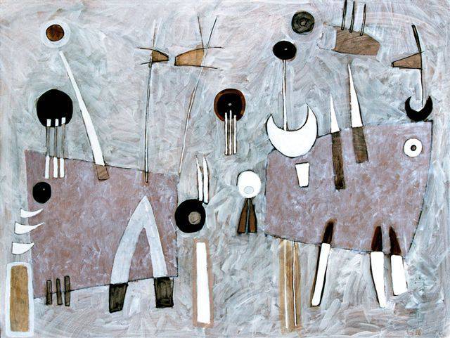 The painting is dominated by a cool color palette: grays, whites, and subtle browns. The shapes evoke abstract forms, reminiscent of geometric figures from fairy tales. The composition is dynamic, full of surprising lines and contrasts. The artist skillfully combines chaos with harmony, creating a space brimming with mystery. The atmosphere? Hmm, otherworldly. A bit surreal, a bit dreamlike. The style? Abstract, full of loose energy, enchants with its lightness and experimental flair. The techniques? Powdery brushstrokes visible in almost every corner, adding texture and depth. The work evokes both anxiety and delight; you can lose yourself in it for a while. Sometimes it seems as if the figures in the painting are about to come to life, doesn't it? It's a painting that stimulates the imagination. Perhaps a child would say they're strange aliens on a walk. And actually, there's something to it! For me, it's a wonderful journey into the recesses of the human mind, full of surprises and hidden meanings.