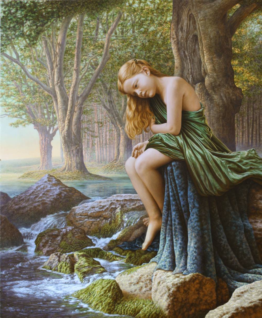 In the painting we see a magical scene that immediately draws the eye. Greens and browns dominate, giving the whole a calm, natural atmosphere. The smoothness of the water contrasts with the roughness of the rocks, and the leaves of the trees form a delicate veil through which soft light filters. The figure of a girl, dressed in a green gown, seems to blend into the surroundings, as if she were part of this forest world. Her golden hair flows like a river over her shoulder, and the expression on her face may suggest deep reflection or rest. Wow, she looks like a princess! The work carries a note of nostalgia, and the realistic painting technique emphasizes every minute detail. The artist has perfectly captured a moment of tranquility that allows for a momentary escape. It’s like a dream in which time has stood still. The painting can evoke a longing for nature and simple moments of relaxation. This scene invites reflection, reminding us of the beauty hidden in everyday life. It is a true feast for the eyes and the soul.