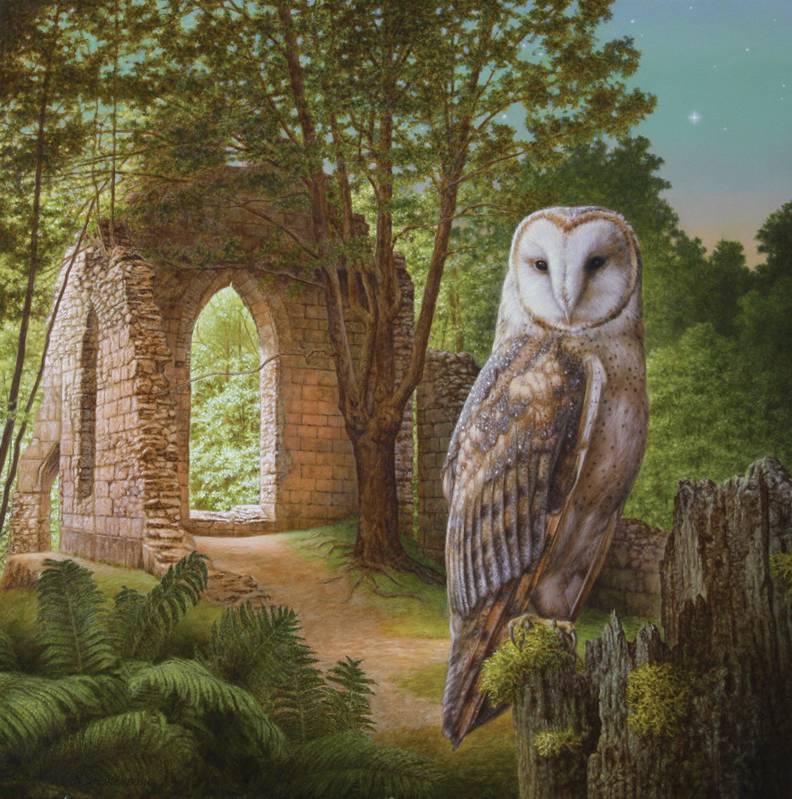 In the painting we see a charming scene from the wild. Its focal point is a majestic owl, sitting proudly on an old stump. Its feathers shimmer in various shades of brown and white, with delicate speckles adding to its charm. The background is an eerily beautiful forest, where tall trees intermingle with the ruins of an ancient structure. Sunlight gently filters through the leaves, giving the whole scene a magical, almost fairy-tale mood. The owl looks like a wise guardian of this forgotten place. The composition of the painting is balanced, with a clear division between the owl and the ruined structures, which seem to tell a mysterious story. The artist used a very detailed painting technique, which gives the work a realistic character while preserving a touch of fantasy. Looking at this painting, one can feel peace and melancholy. Isn’t it beautiful? The colors are harmonious, and the owl seems to look straight at us, as if it had some “secret” to tell. The painting evokes associations with childhood and tales of magical forests. It is an ideal scene for dreaming and spinning stories. Mom, that owl is probably very wise, isn’t it? This piece can inspire reflection on the passage of time and the endurance of nature, which persists even when human creations crumble.