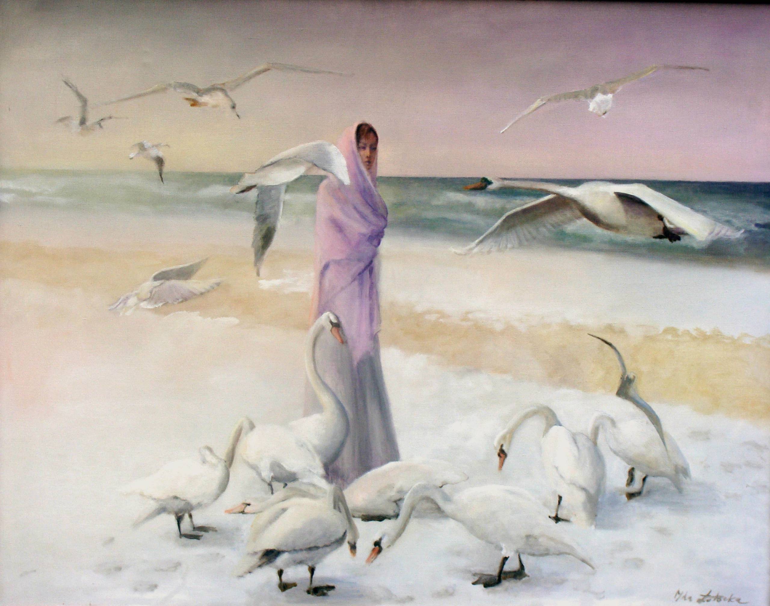 The painting exudes tranquility and delicacy. In the foreground, a woman wrapped in a lilac shawl gently contrasts with the pastel background. The seaside landscape blankets the setting in muted shades of beige and green, and gulls in flight appear in the sky, adding a sense of dynamism. The whole scene is like something out of a fairy tale. The silence that reigns in this painterly moment almost rustles in your ears. The artist employed gentle tonal transitions, lending the painting softness. The painting technique suggests subtle brushstrokes that create an almost ethereal, blurred atmosphere. Looking at this work, one can feel nostalgia and calm. As if the moment, held still, offered a chance to escape everyday life. A bit like relief after a storm, mixed with the warmth of a summer afternoon. The woman surrounded by swans seems to be a symbol of harmony between humanity and nature. A kid would say: “The lady who hugs clouds.” This innocent interpretation adds charm to the whole viewing experience. The painting brings to mind memories of a carefree childhood, when the world seemed full of magical moments. You can feel lightness, and also a certain melancholy, but one that wraps you like a favorite blanket.