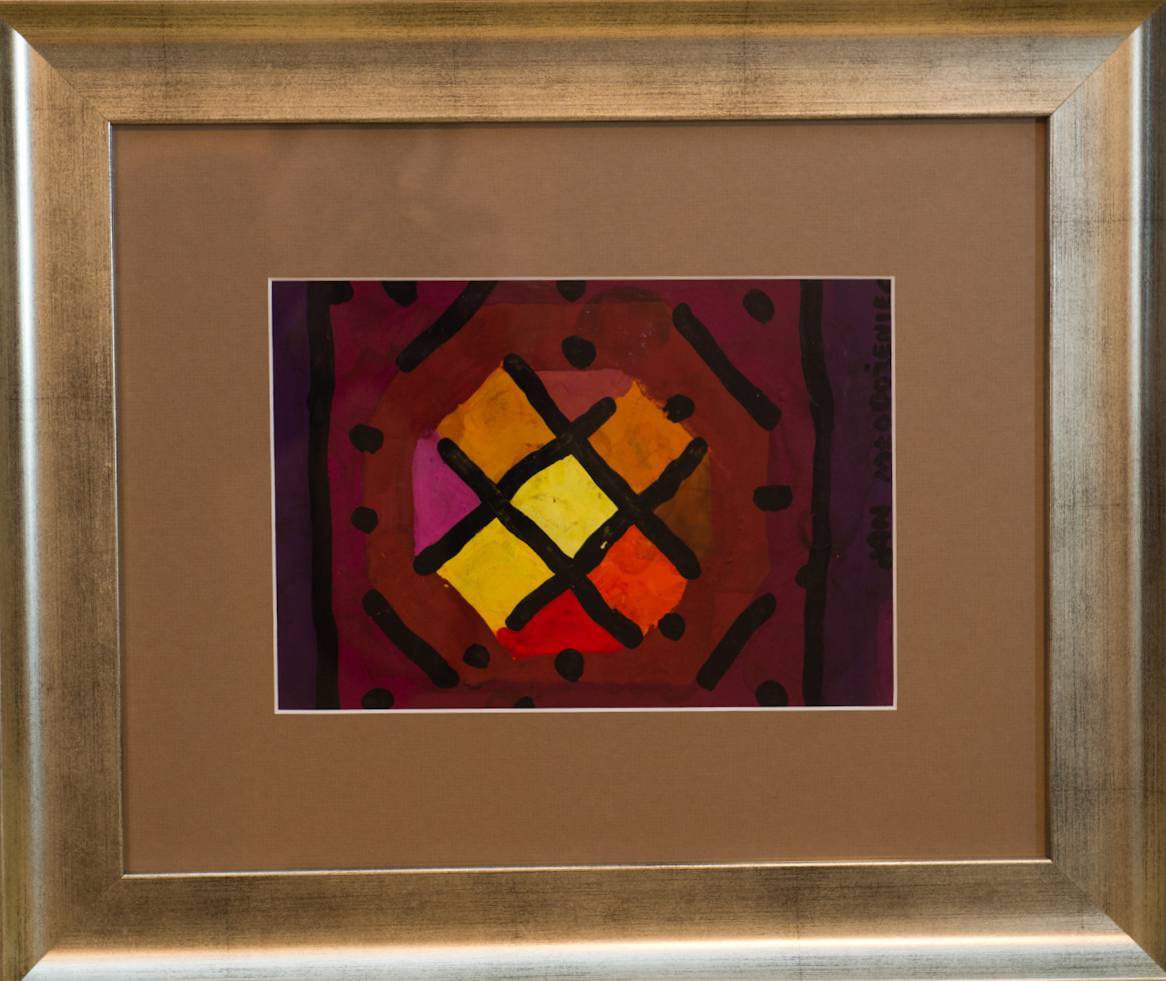 The painting attracts the eye with its intense colours: deep purple intertwines with warm shades of red, orange and yellow. In the centre, we can see geometric shapes, resembling a grid or crossed lines that spread out to the sides. The composition is simple, but at the same time intriguing, thanks to the contrast between the dark lines and the light background. The whole frame adds elegance. The mood of the painting is a bit mysterious, as if it were hiding some secret. It could be a space full of warmth that emanates from the related colours, and at the same time it arouses a bit of anxiety due to the dark elements. The artist probably used watercolours or poster paints, which can be seen in the delicate colour transitions and colour intensity. Looking at this work, you can feel both peace and tension at the same time. Each element seems to be in its place, as if by accident, but with intention. The painting reminds me a bit of a kaleidoscope from my childhood, which could change with every rotation. "Wow, what nice colours!" - yes, that's something a child could say, looking at it. Sometimes such simple shapes and colors reach the heart more than complicated works. The artistic technique is bold, strong and full of dynamics, as if the image itself wanted to jump out of the frame.